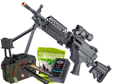 The M249 Support Package comes with everything needed to get your SAW up and running including a high quality 7.4v LiPo battery pack with BMS charger, 5000 rounds of .25g precision grade BB's. Also included is a 1500 round pressure switch activated electric winding "sack" magazine. The "sack" style magazines are the perfect middle ground between a STANAG magazine and the bulky 2500 round box magazine. The smaller profile helps make the gun much more maneuverable while still having the capacity to unleash BB fury upon your foes.