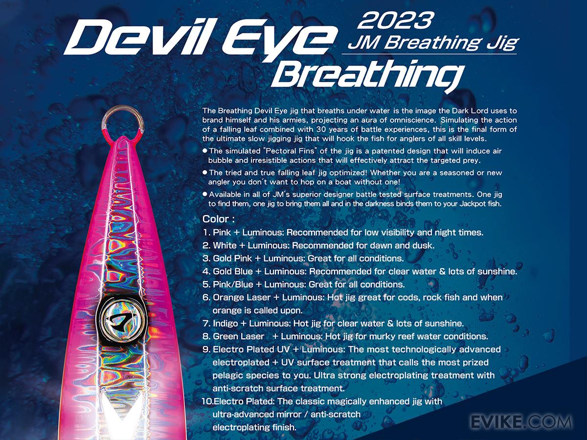 The Breathing Devil Eye jig simulates breathing fish under water making the jig hard to resist and more lifelike. Simulating the action of a falling leaf combined with 30 years of battle experiences, this is the final form of the ultimate slow jigging jig that will hook fish for anglers of all skill levels.