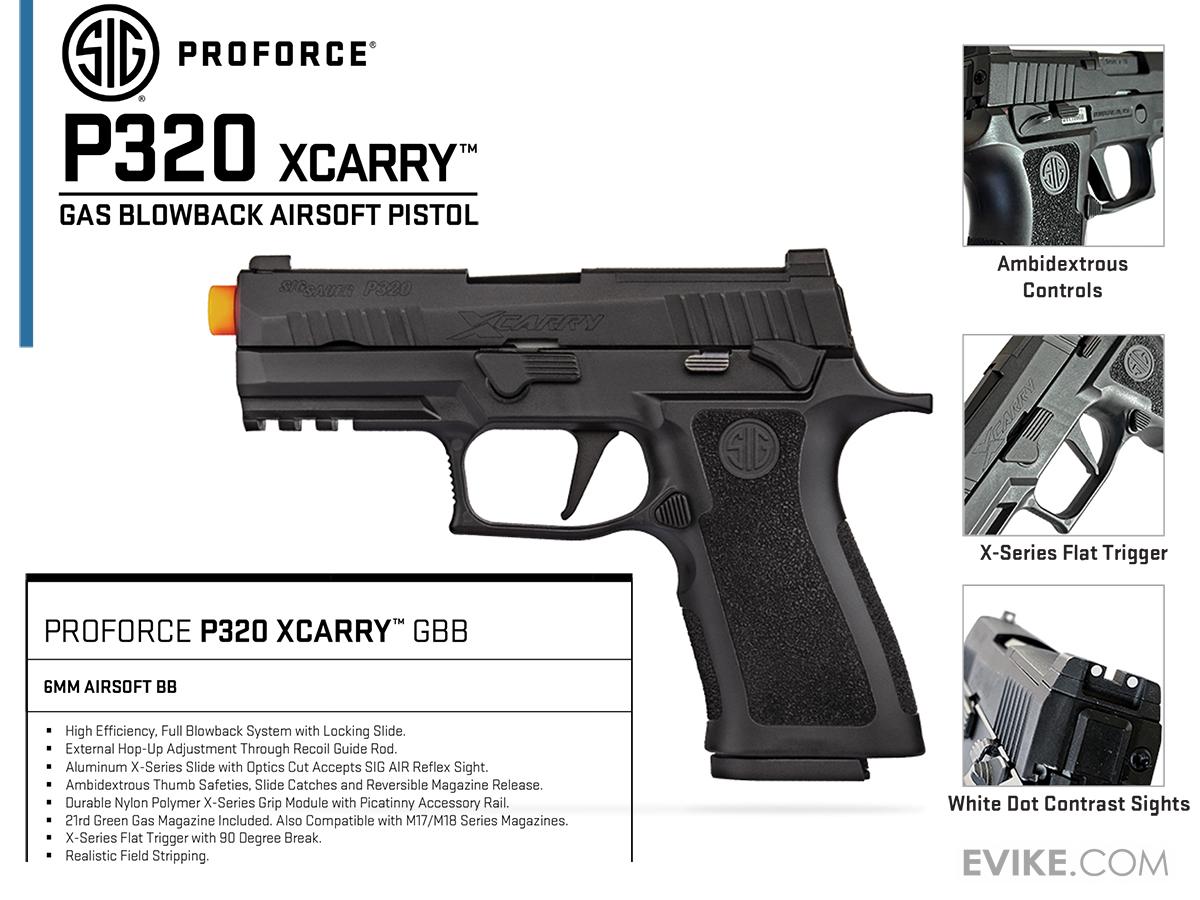 Other features include a revolutionary hop-up system which can be adjusted by rotating the recoil guide rod and thus eliminating the need to remove the slide to make adjustments typical of most airsoft models on the market. This airsoft pistol also has superb attention to detail with engraved slide and authentic stippling and SIG SAUER markings molded into the grip module. Additionally, the Proforce P320 XCARRY is field strippable exactly like its centerfire counterpart adding even more realism to this model.