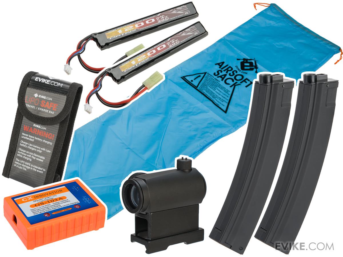 The package includes: two high quality Matrix 7.4v LiPo Stick type rechargeable battery packs so you will have a spare to swap to while the other charges, a LiPo safety bag to safely store your battery while charging, a universal smart charger that will optimally charge your batteries every time, two spare magazine to allow you to carry extra ammo out onto the field, a quick acquisition red dot optic for easy aiming, and finally an Airsoft Safety Sack to store your gun in during transport.