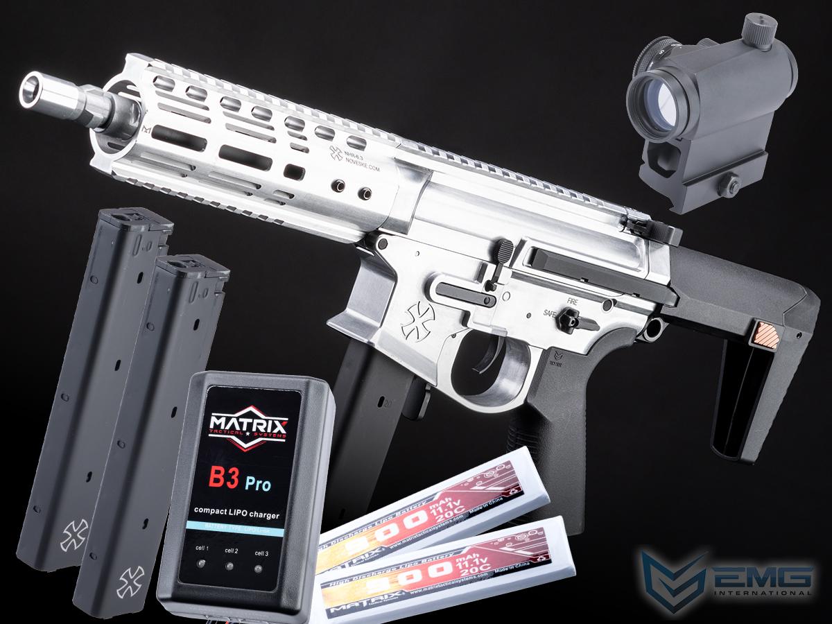 • Package Includes: Gun, Magazine, Flip Up Front & Rear Sights, 2x Additional Magazines, 2x Matrix 11.1v LiPo Battery, T1 style Red Dot Optic, LiPo Balancing Smart Charger, LiPo Safe Charging Bag, Airsoft Safety Sack