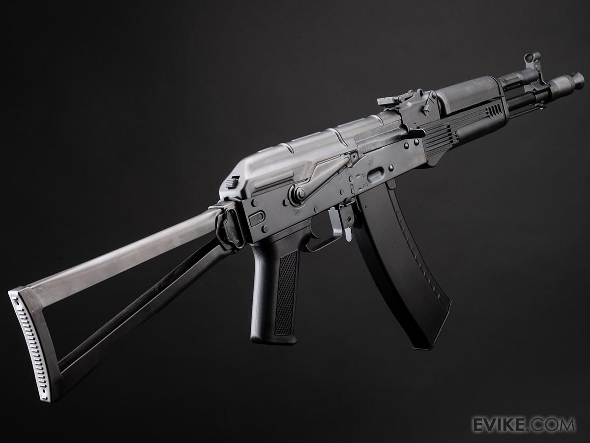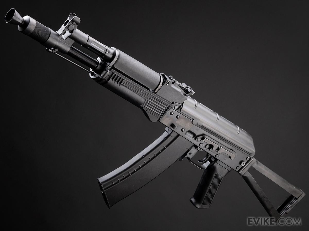 The AK receiver is made from stamped steel, and is riveted for added durability. Internally the rifle features a reinforced 8mm TM compatible version 3 gearbox with a quick change locking spring guide; this ensures compatibility with the great majority of aftermarket parts as well as allowing easy spring changes without disassembly of the gearbox itself. The rifles come from the factory with neodymium magnet motors and a pre-installed MOSFET for improved performance and longevity out of the box.