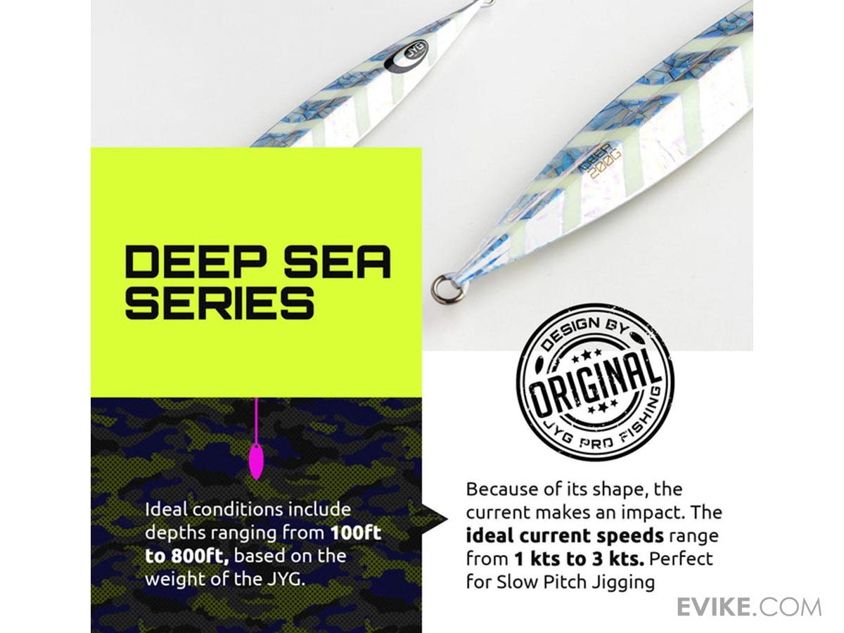 Unmatched Depth Performance: The Deep Series Slow Pitch Jig is engineered to reach and explore extreme depths with ease. Its streamlined design and precisely balanced weight enable it to sink rapidly, making it the perfect choice for deep-water expeditions where the most coveted species reside.Wire Through Design: Reinforced for the toughest battles, this jig features a cutting-edge wire-through design. This design not only enhances the jig's strength but also ensures that it can handle the most powerful adversaries lurking in the abyss, providing you with the confidence to take on any challenge.Seductive Flutter Action: Designed for the discerning angler, this jig boasts a seductive and lifelike fluttering action during the descent. Its movements mimic wounded or struggling prey, enticing predatory fish to strike with unwavering determination.Durable and Resilient: Crafted from high-quality materials and finished with precision, the Deep Series Slow Pitch Jig is built to withstand the rigors of deep-sea battles. Its robust construction ensures longevity and reliability in the harshest conditions.Weight Options for All Depths: Available in a versatile range of weights, from 25g to a whopping 400g, this jig is adaptable to all your deep-sea scenarios. Whether you're exploring shallow underwater structures or tackling the abyss, you'll find the perfect weight option to match your fishing style.Eye-catching Color Variations: Available in a range of eye-catching and UV-enhanced colors, this jig ensures high visibility even in the darkest depths. The holographic finishes and vibrant hues are designed to attract attention and trigger aggressive strikes.Glow-in-the-Dark Technology: Elevate your jigging game with our glow-in-the-dark innovation. Even in low-light or deep-sea conditions, this jig retains its visibility, ensuring that it remains an irresistible target for game fish lurking in the darkness.Elevate Your Deep-Water Fishing Experience: The Deep Series Slow Pitch Jig by JYG PRO Fishing is more than just a lure - it's your key to conquering the depths and landing the trophy fish you've been dreaming of. Whether you're targeting pelagic giants in the open ocean or probing the mysterious depths of underwater structures, this jig empowers you with the confidence to face the challenges of deep-water fishing head-on.