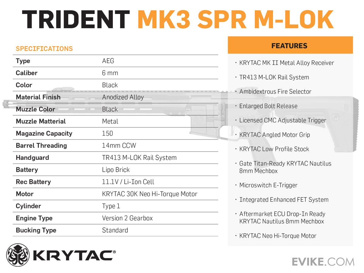 The KRYTAC MK3 SPR M-LOK is designed for precision and long-range dominance. It features the updated KRYTAC Nautilus mechbox with 8mm high performance bearings and a ported full metal rack piston, complemented by an integrated enhanced FET system offering faster trigger response, partial active braking, low battery detection, and gear strip protection. The MK3 SPR also features a micro switch e-trigger and an updated bonded neo high-torque motor for quick, minimal lag during high-tempo gameplay. Additionally, the upgraded rotary hop-up ensures consistent accuracy. The SPR excels in delivering consistent power and precision over extended distances, making it ideal for outdoor skirmishes and players who prioritize tactical advantage for afar.