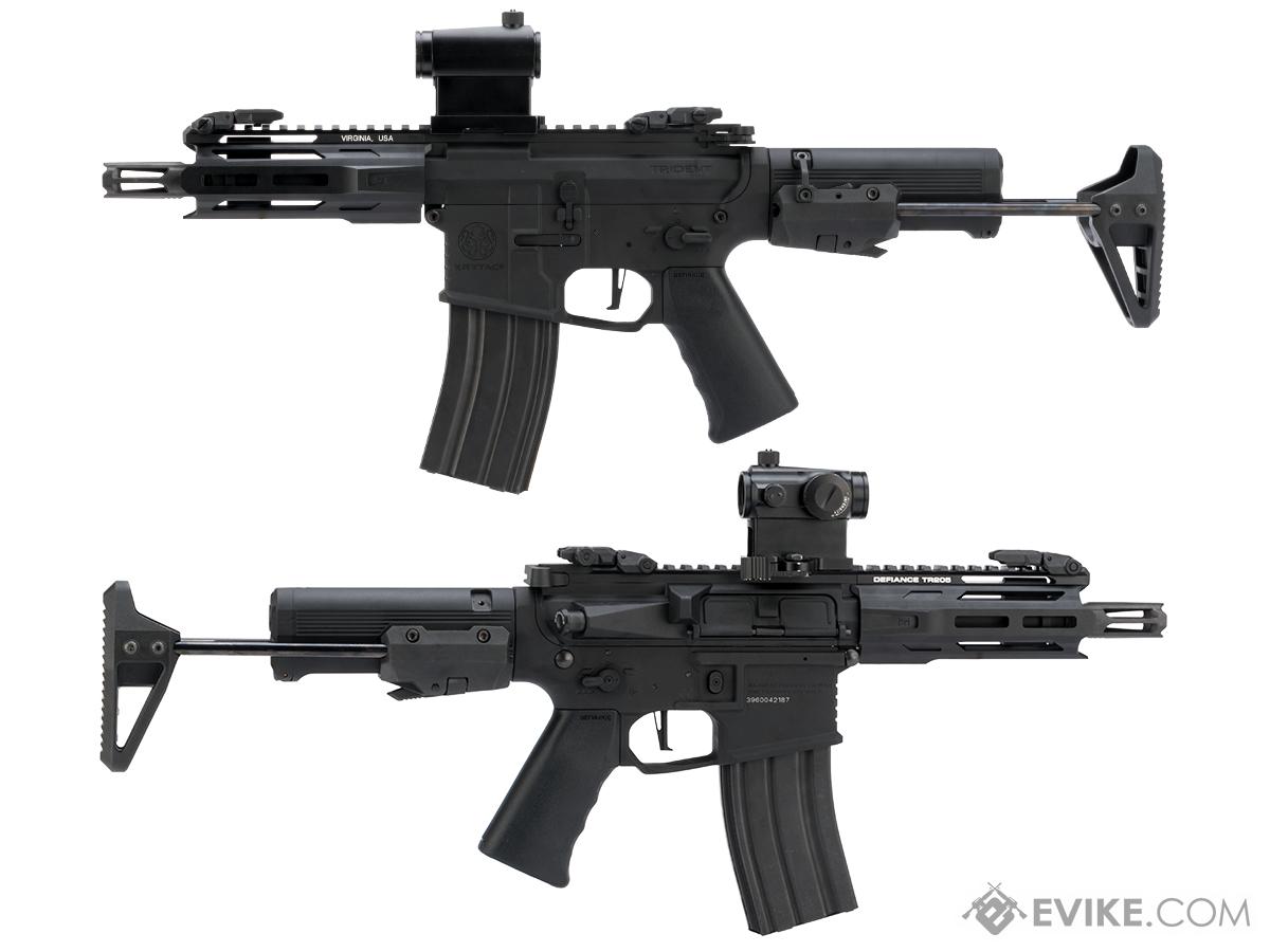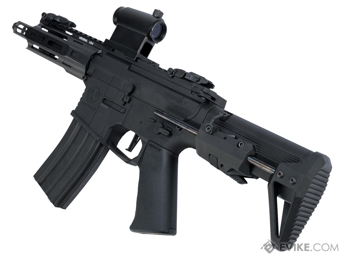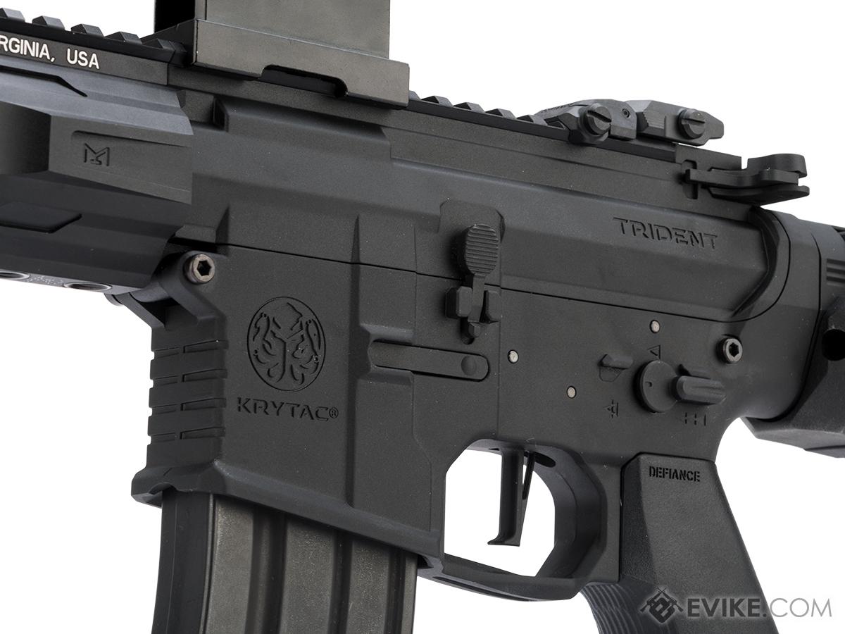 The Trident MK2 PDW is the most compact rifle in the series and is designed for maximum maneuverability and control, in close quarters combat. The full metal AEG features a short 5.5" barrel and a 5" free floating, licensed KRISS® M-LOK hand guard. The KRISS® hand guard features three prongs at the front that can be used to brace the gun against barricades, eliminating the need for an aftermarket barricade stop rail accessory. The MK2 aluminum receivers feature a modern design style with a stamped KRYTAC logo and include an integrated trigger guard. An originally designed KRISS® pistol grip enhances the rifle's comfort. Additional features include an ambidextrous fire selector and a locking bolt that provides easy access to the KRYTAC rotary hop-up system. The KRYTAC rotary hop-up has 15 adjustment settings and a numbered adjustment wheel for a quick reference point to determine how much hop is needed. The futuristic KRYTAC sliding stock is adjustable to two positions and is supported by the enhanced KRYTAC buffer tube to allow space for a wider range of batteries. The PDW utilizes AR/M4 style magazines and sports similar controls for those familiar with the platform. In addition to looking futuristic and functional, the PDW is also a fantastic performer thanks to its gearbox.