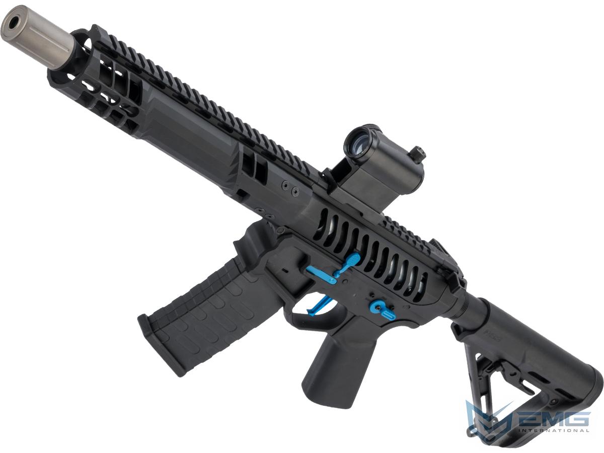 - Blue flat-faced trigger, New ACETECH Brighter C Tracer, shortened 9" black barrel