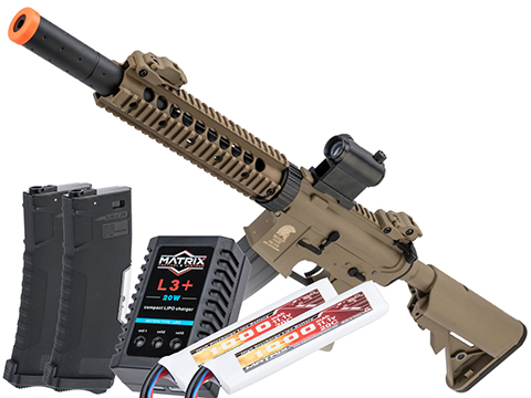 The Evike "Go Airsoft Starter Package" has been carefully curated to include the base essentials needed to get your AEG up and running for your first Airsoft game. Everything chosen for this package consists of highly recommended add-ons from both experienced players and technicians alike; great for first time players or for anyone looking for a backup set of accessories. The package includes: two high quality Matrix 11.1v rechargeable LiPo battery packs so you will have a spare to swap to while the other charges, a Matrix LiPo balancing smart charger that will optimally charge your batteries every time, a LiPo Safe charging bag, two spare BAMF Gen2 Mid Cap Magazines to allow you to carry extra ammo out onto the field, a quick acquisition red dot optic for easy aiming, and finally an Airsoft Safety Sack to store your gun in during transport.