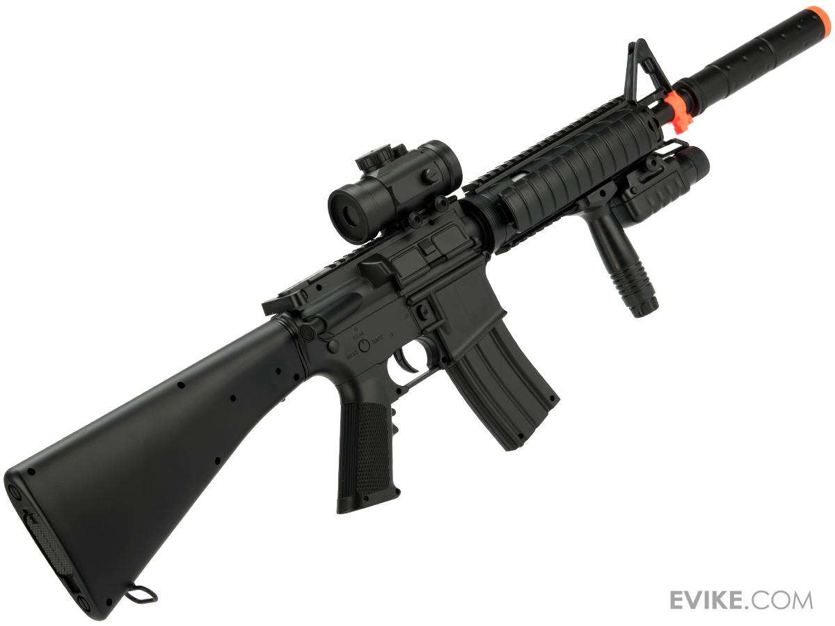 Package Includes:M4 SR-16 Electric Rifle, Magazine, Battery, Charger, Red Dot Scope, Flashlight, Mock Silencer, Rail Cover Panels, and Safety Goggles