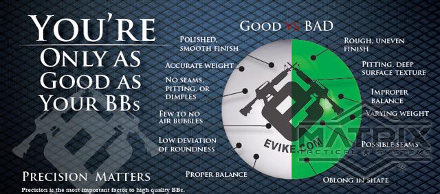 You are only as good as your BBs. Accuracy and range start with precision BBs. Precision BBs provide minimal difference between the diameter of your inner barrel and the BB itself creating the perfect air seal. To ensure maximum accuracy, range and power, without jamming, we urge all Airsoft players to use only high quality Precision / Match grade BBs.