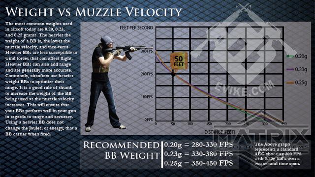 *The chart above is for reference only. The best way to determine the weight that works best with your Airsoft gun is to test them. Results will vary due to factors such as hopup, wind, inner barrel diameter, brand, etc.