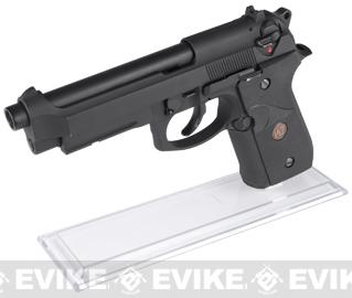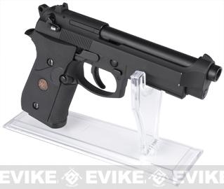 A nice low profile / clear / useful gun stand for true collectors and enthusiasts. This gun stand displays your hand-gun with or without the magazine unlike most stands. Affordable, easy to use and a must have for those looking for the best way to display your collections of pistols.