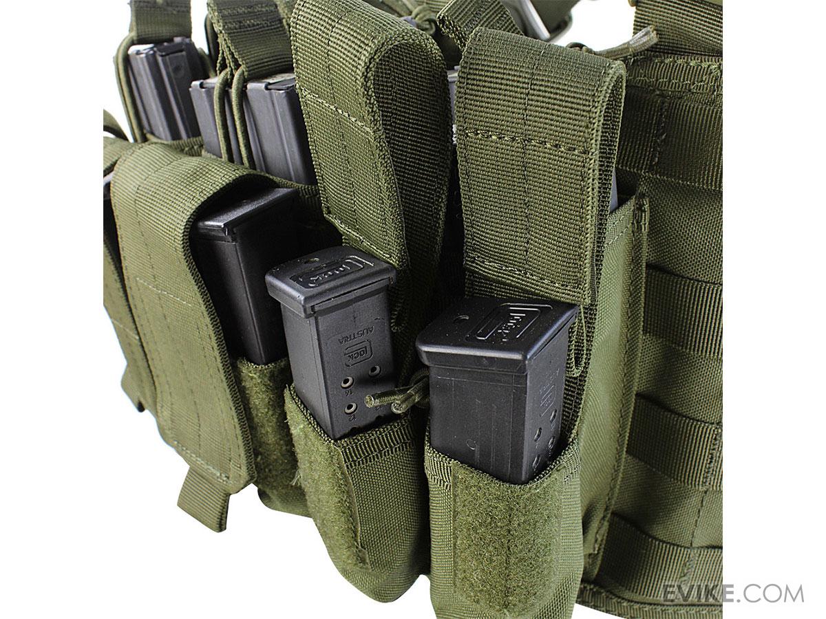 • Chest rig comes with three built-in stacker/Kangaroo type mag pouches, will hold six M4 mags and six pistol mags