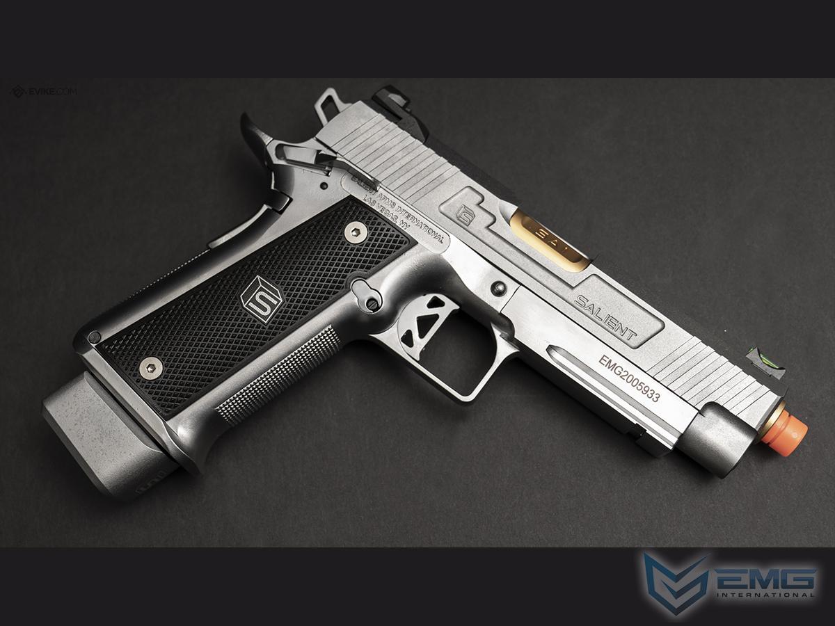 EMG has extended their collaboration with the Salient Arms and is proud to release the Salient Arms x EMG DS 2011 collaboration Airsoft Training pistol. Manufactured with an eye to detail the EMG SAI DS 2011 is CNC machined from aluminum alloy and features all of the trademarks of a Salient Arms pistol, including: a titanium nitride style barrel, competition style sights with fiber optic front insert, ambidextrous safety and, of course, stamped Salient Arms International rollmarks. Utilizing the Tokyo Marui Hi-Capa gas system, the Salient Arms / EMG DS pistol can be upgraded from a wide pool of available parts and components, ensuring easy repair and maintenance and years of reliable service.