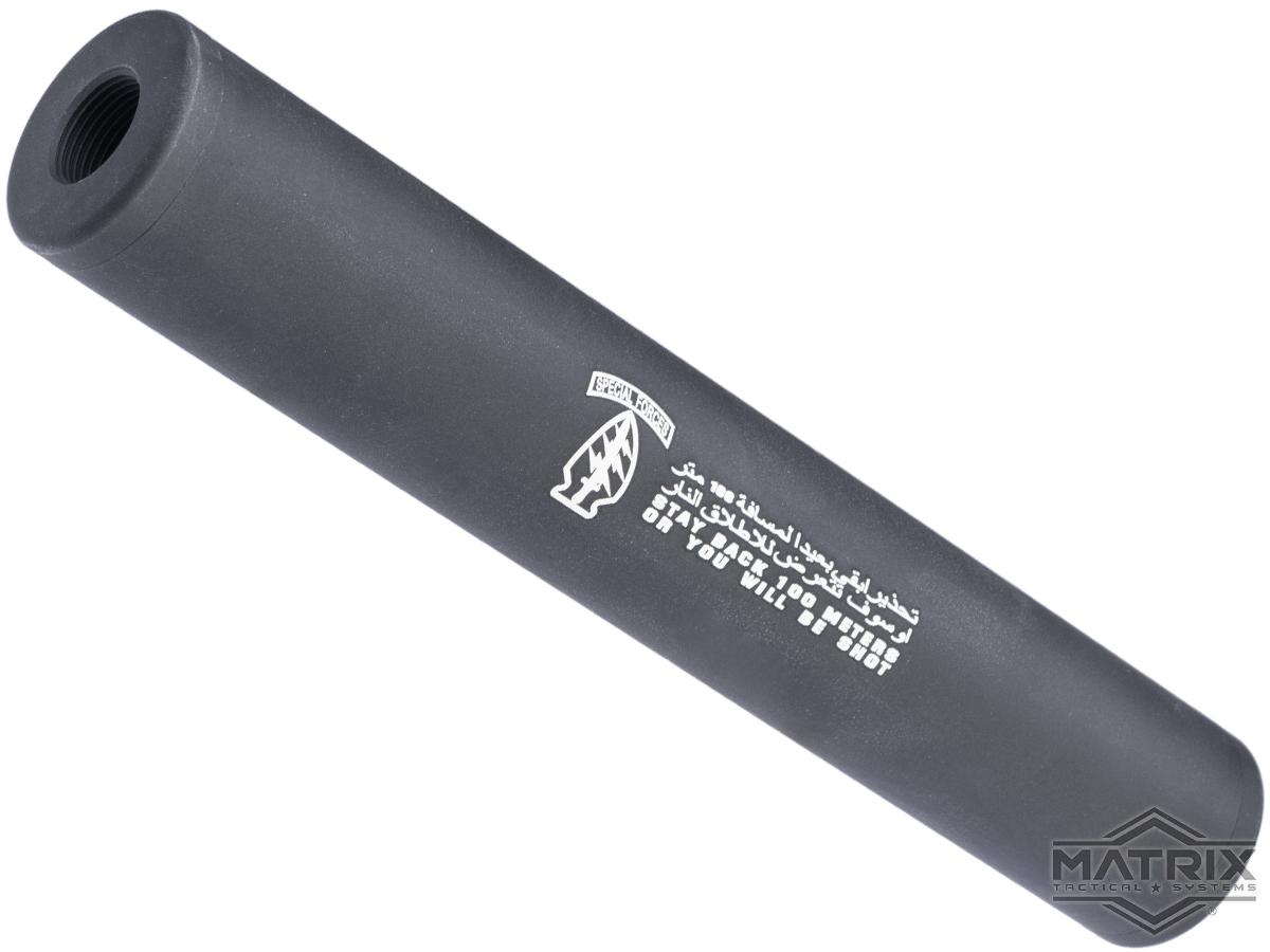 The Matrix MS180 mock silencer series is equipment designed to last, to increase your firepower, and to turn heads. Constructed out of high quality aircraft grade aluminum, every MS180 is CNC machined for precision and durability. Finished with an anodized surface treatment, the Matrix MS180 is sleek, trim, and rugged. Every MS180 is integrated with built in 14mm positive and negative threaded ends to accomodate all 14mm barrel applications, allowing quick installation and removal. The MS180 can both increase intimidation and house a longer inner barrel for enhanced accuracy and range.
