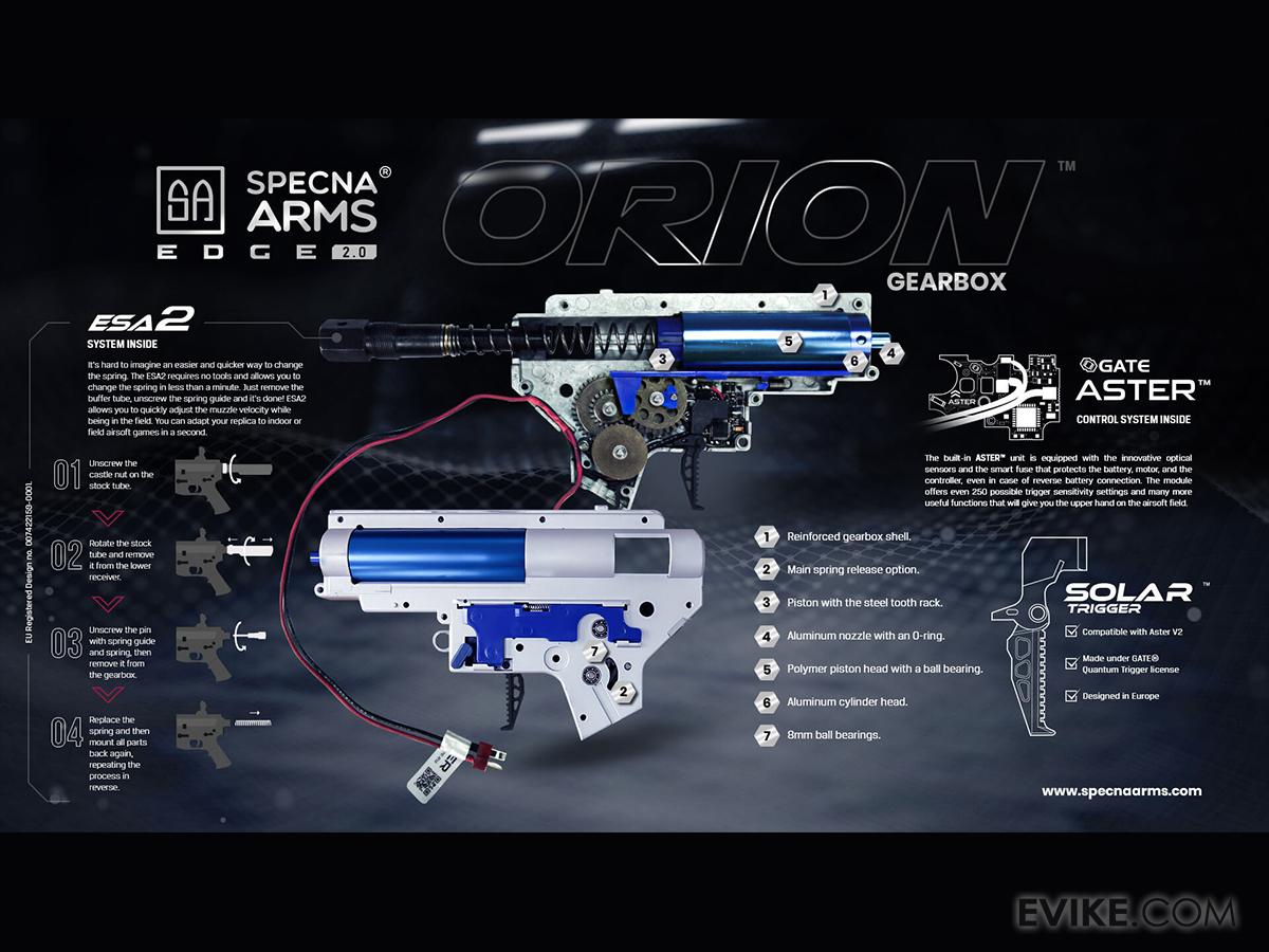 • Orion 8mm gearbox comes pre-installed with a reinforced piston with steel teeth, aluminum nozzle, polymer double-sealed piston head w/ bearings, ball bearing spring guide, and steel gears