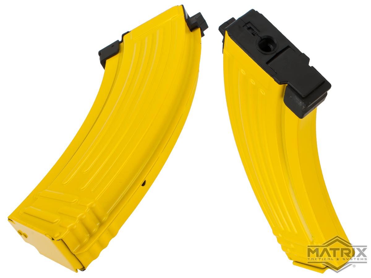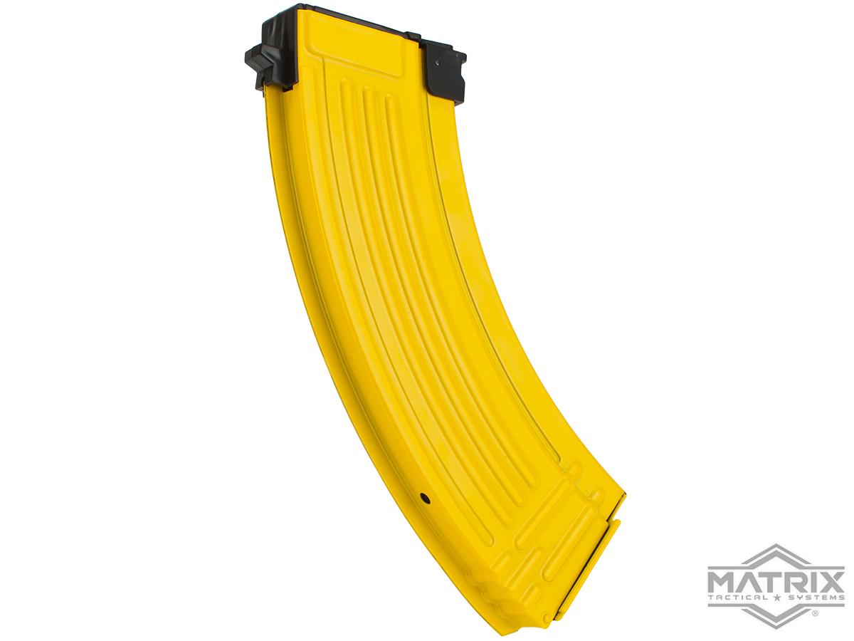 The Matrix Banana magazines are superb feeders featuring high-tension internal spring and tactical Banana externals. Every Banana mag is designed to provide excellent performance, high durability, maximum visibility, and the ability to satisfy your hungry AK's appetite. The Bright yellow Banana tactical casing can be tactically utilized to distract the opposing force so while you play the role of the tactical decoy, your allies may swiftly move in to claim victory; go teamwork! If you happen to be in the jungle and find a banana tree, you may utilize the Banana mag as a form of camouflage to help you blend into your surroundings (disclaimer: may attract monkeys).