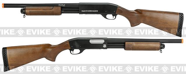 The S&T M870 series of shotguns come fully featured at an attractive price point. These shotguns come standard with a metal receiver and barrel set for that improved realistic weight and feel. Internally the shotguns utilize an easy to cycle spring powered system that does not require batteries or gas to operate. The shotguns boast impressive power and are capable of making accurate and consistent shots. The furniture on these shotguns range from high impact polymer, to imitation wood grain, to CNC machined aluminum; find the configuration that best suits your needs.