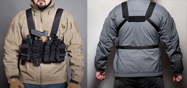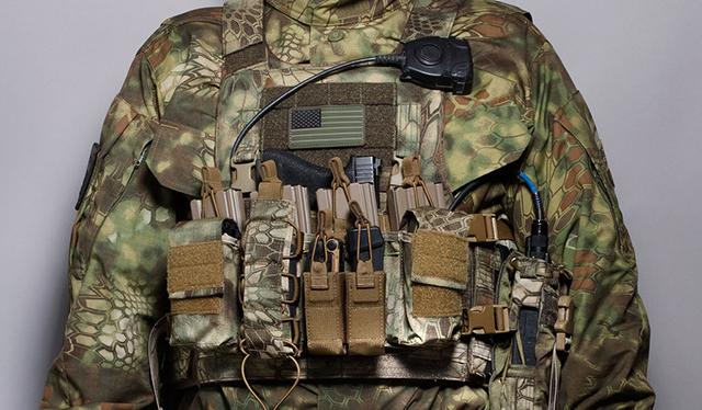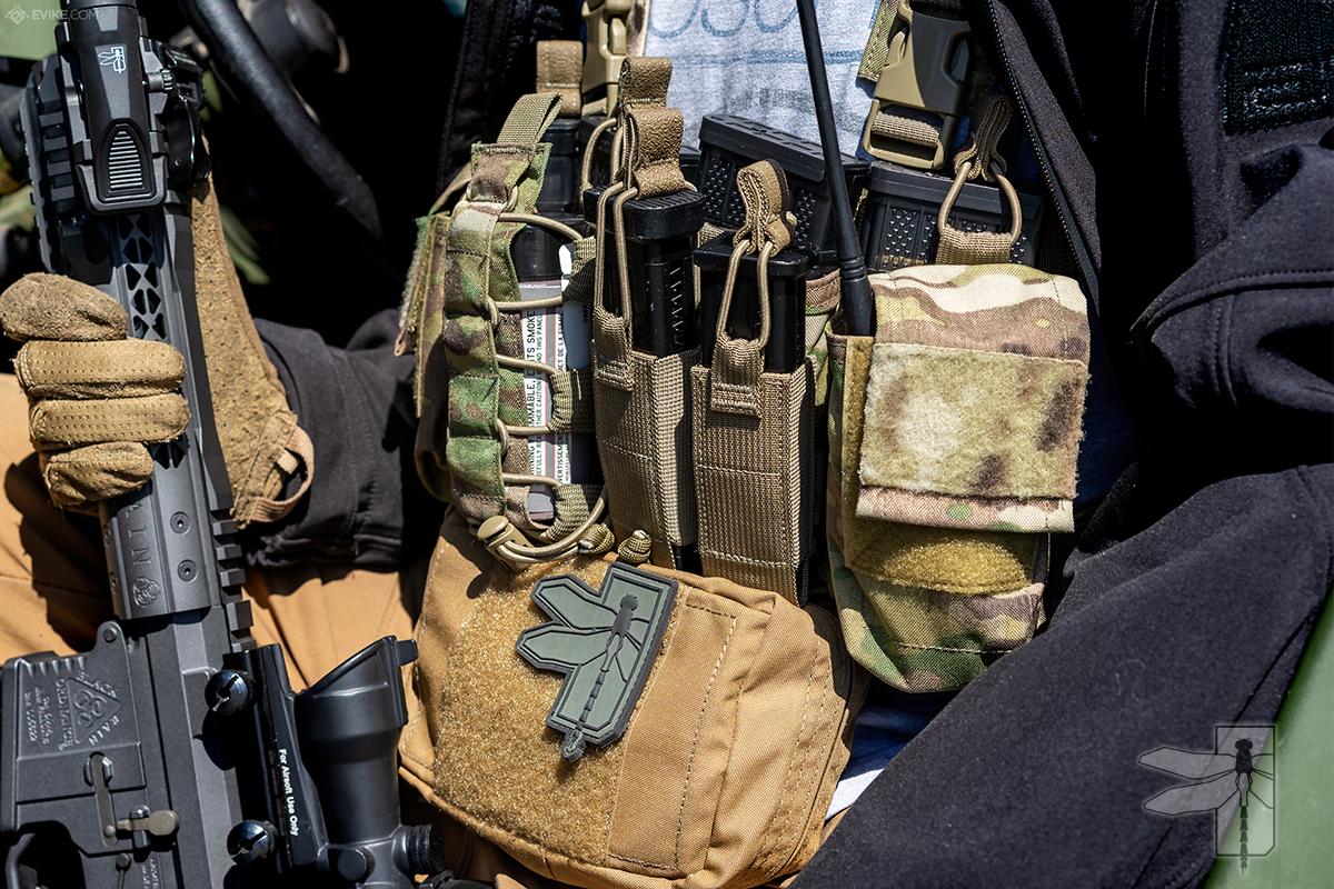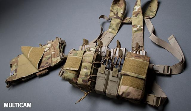The rig intentionally does not include a radio or dedicated full size medical pouch so no matter the posture, essentials such as communications and medical kits can remain on the end user at all times.
