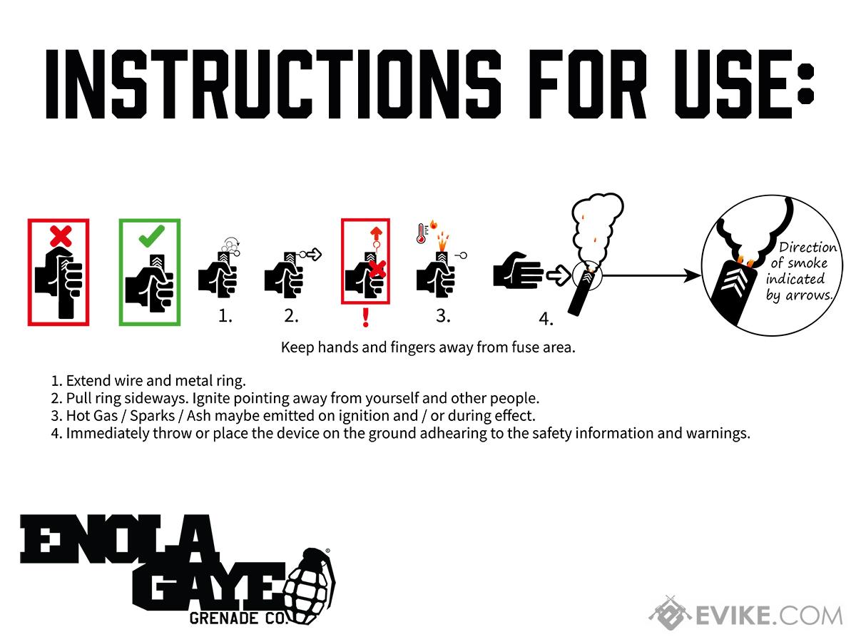 Smoke Grenades and other pyrotechnic items are extremely volatile and must be handled with proper care. Failure to follow instructions below exactly can be dangerous and may result in fire, property damage, personal injury, and/or even death.
