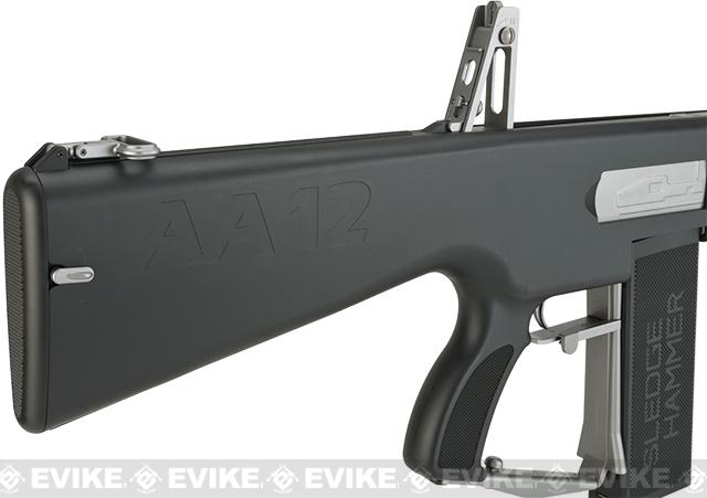 Tokyo Marui introduces the worlds first AES or Airsoft Electric Shotgun in the from of the AA12 otherwise known as the "Sledge Hammer". Featuring a unique proprietary geabox and tri-barrel configuration, the Sledge Hammer utilizes three separate hop-ups allowing the user to zero in their bursts for the utmost effectiveness in combat. The sledge hammer is the shotgun you turn to when you are in search of total CQB domination.