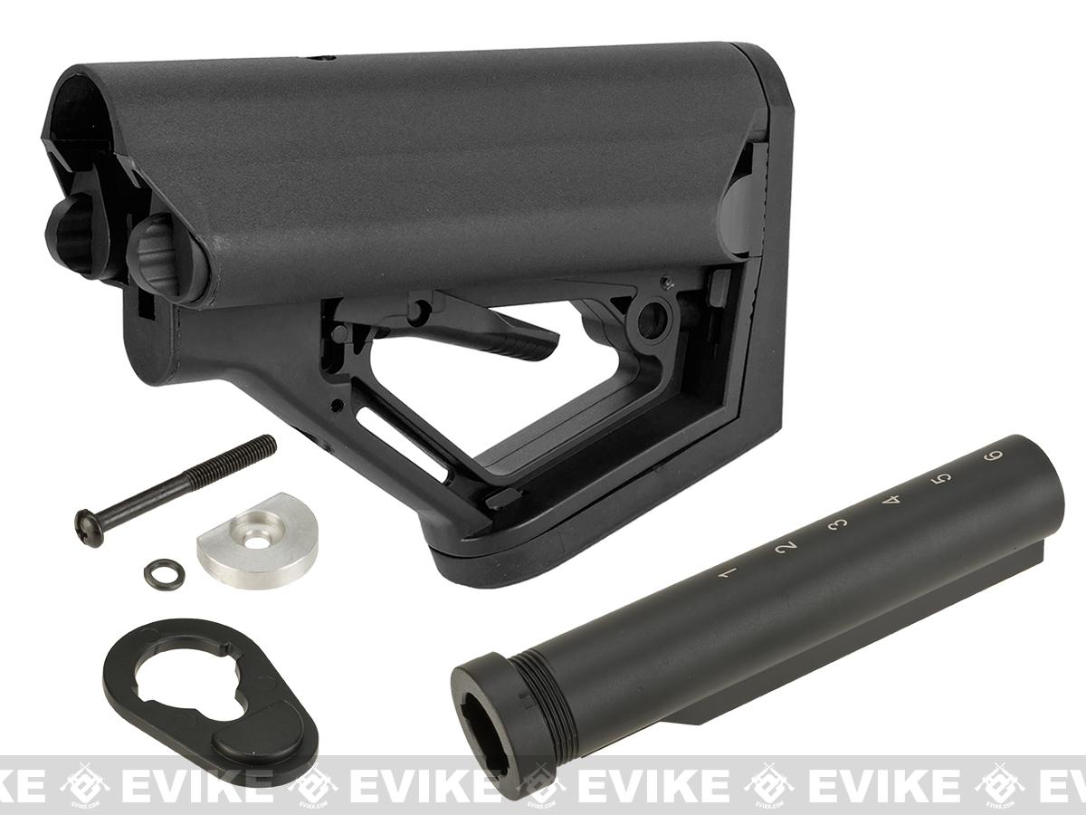 *Battery not included, this listing is for the black color stock. (tan stock in image not included). This stock may fit the buffer tube of your rifle, but not guaranteed by Evike.com.Designed with Airsofter and shooters in mind, the CTS stock is a slick looking stock packed with features and functionality. Made out of extremely durable and lightweight injection molded polymer, the CTS stock features an unique "stock roll" design allowing users to go from a ready position to a shooting position in the most ergonomic and comfortable roll possible. Other features includes an XL rubber butt pad for maximum comfort, enlarged glove-friendly lever cam, ambidextrous QD sling points, milled hole for numbered buffer tube, and most importantly of all it is compatible with most major AR-15 / M4 platforms and is designed to enable extremely fast battery swap.