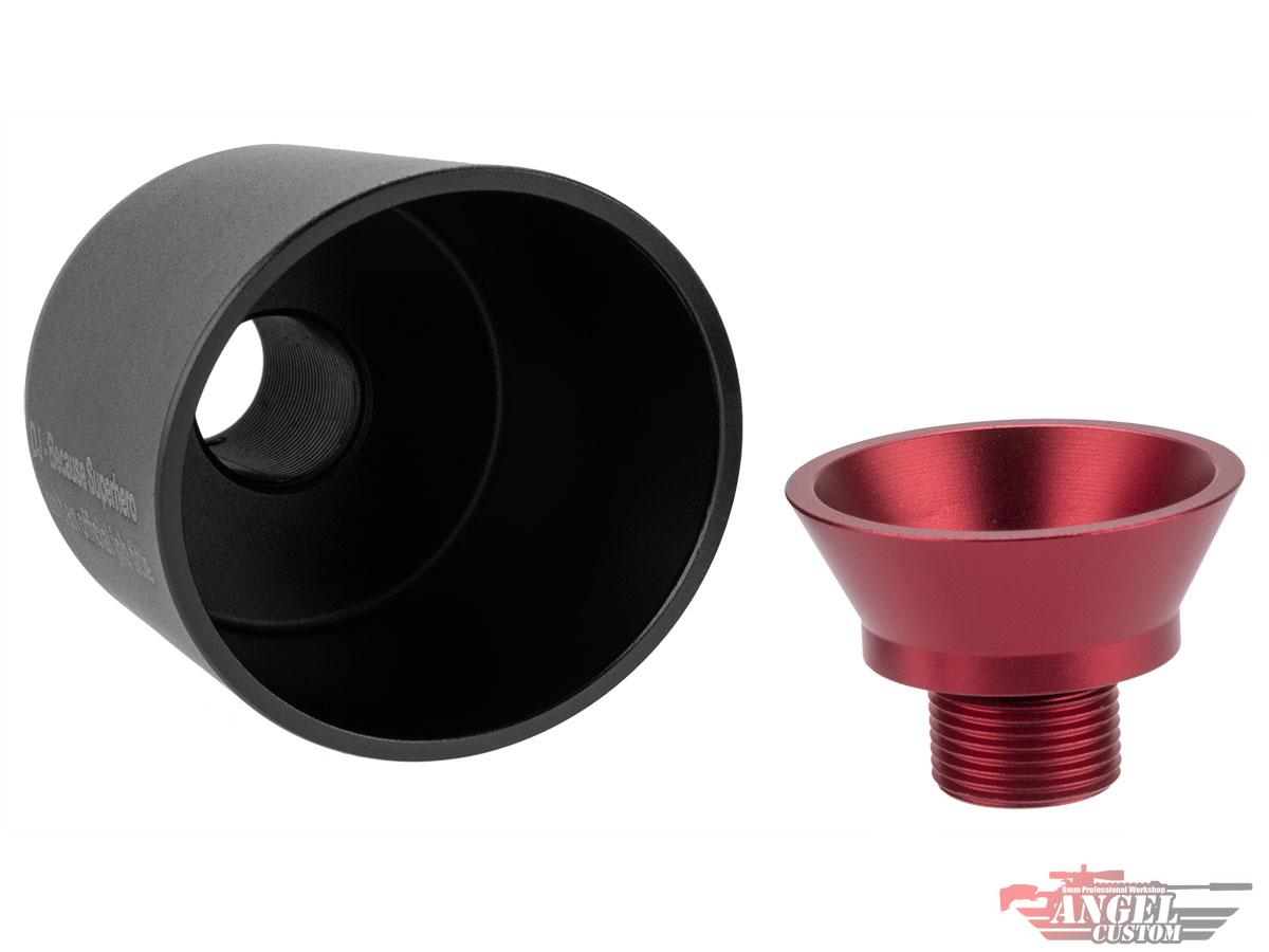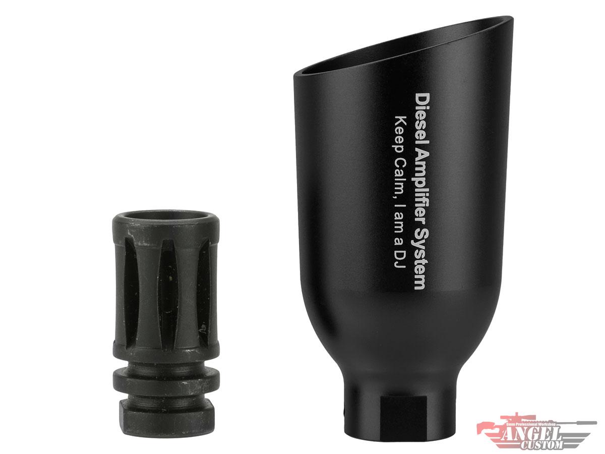 *Birdcage flashhider not included, for reference onlySome players like to be sneaky and stealthy, keeping to the shadows and eliminating their foe without them even knowing where the shot came from. Others however, do not. Some players prefer to come blazing out of the darkness with their guns detailed in bright anodized parts and their masks brightly colored visor reflecting under the fluorescent lights of their favorite CQB field, these are the players the Angel Custom Diesel amplifier was developed for. The Diesel is an easy to use and easy to install amplifier that takes your preferred Airsoft blaster of choice from scary to terrifying. The Diesel amplifier makes the report of your piece considerably louder ensuring that your quarry knows that you are on the prowl and that there is no safe place to hide. Built from lightweight but extremely durable aluminum alloy, the Diesel adds only minimal weight to your platform of choice and its vivid anodized finish not only protects the amplifier, but looks good doing it.