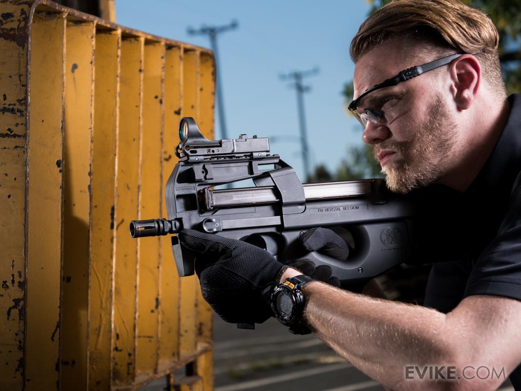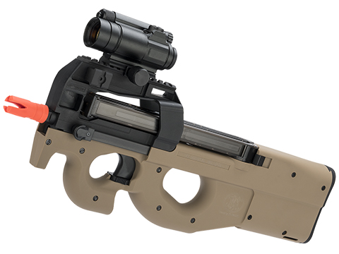 The FN® Licensed Airsoft P90 accurately replicates the great handling and ergonomics of the real P90 with its fully ambidextrous control layout and comfortable grip. Just like the actual P90, the FN® Licensed Airsoft replica consists of a durable reinforced polymer frame with metal barrel and upper assembly. Despite its small size, the P90s bullpup design allows for a considerably longer barrel than most sub-machine gun class weapons for improved range and accuracy; paired with the high cyclic rate, this PDW can stand toe-to-toe against significantly larger carbines. Fast, lightweight, and compact, the P90 is one of the most effective weapons for CQB and room clearing.