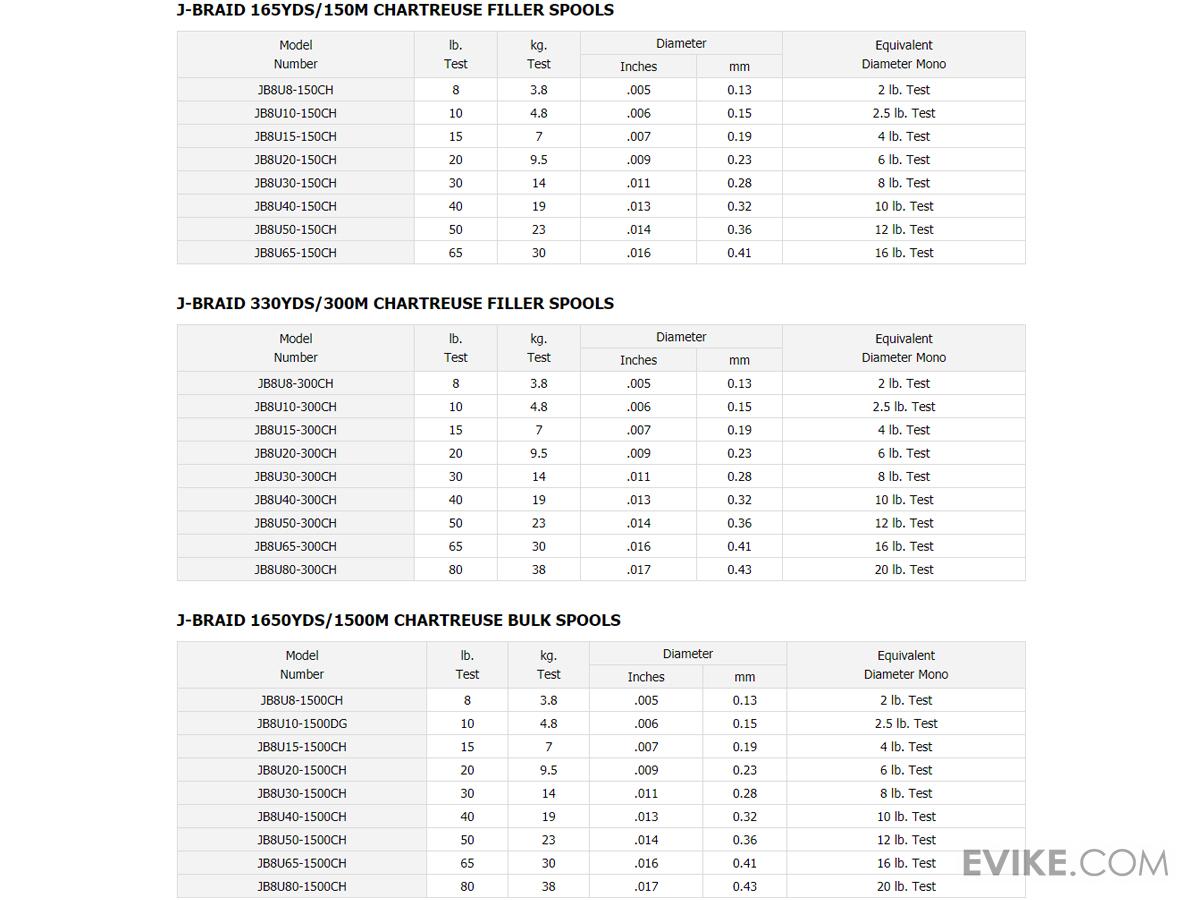 Features 8 braid construction Round-braided High linear strength High abrasion resistance Does not stretch J-Braid line is a complete line up of high quality 8 carrier braid made of the finest materials from Japan. 8 Strands of tightly woven fibers makes for a perfectly round profile. The result is a much stronger, softer and smoother line that is more sensitive and farther casting. J-Braid is one of the best quality and value braided lines on the market.