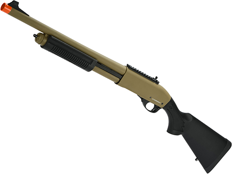 Based off of the popular Tokyo Marui gas shotgun system, the Golden Eagle M870 series of gas powered shotgun brings gas powered, variable burst performance to the masses. Constructed almost entirely of aluminum alloy, the Golden Eagle M870 offers a durable and realistic, gas powered alternative to the popular tri-shot spring powered shotguns.