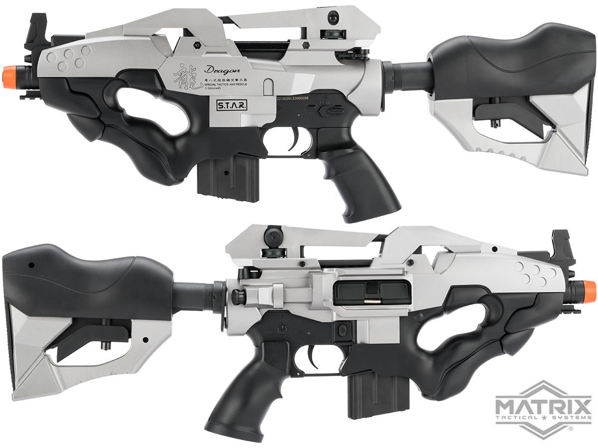 "If you can appreciate the goofy sci-fi looks, you'll love this rifle. Out of the box the Dragon is a lightweight compact short barreled M4 with weird yet comfy furniture. The main con of the STAR Dragon is the cramped battery space, however that can be fixed. I cut down a RIS rail, drilled two holes in the front left side of the body kit (heh), mounted the RIS rail (used blue threadlocker too) & then attached a battery PEQ box. Drilled a hole and fed the battery wire through & upgraded to deans connectors. Now I'm hooked up with a Titan power 6000 MaH 7.4. With stuff like this, there's no problems, only solutions. I carefully dremeled off some of the body kit so I could mount a small light & carry handle rail/red dot. Pulled the stock off so I could flip the sling mount and put a Blackhawk one point on it. Finished off my meddling by threading on an amp. Make your tools work for you.