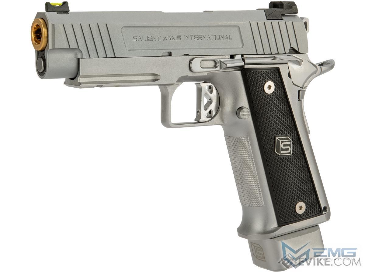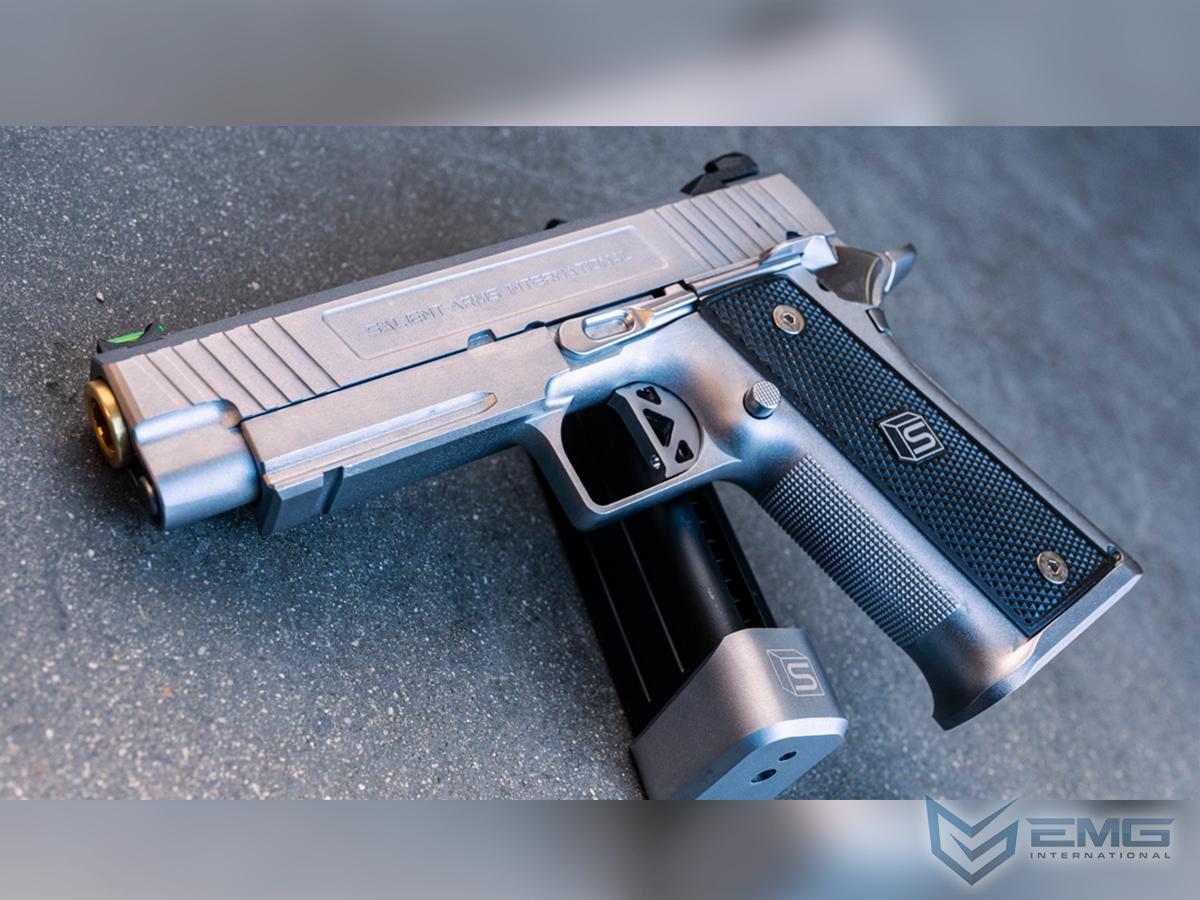 EMG has extended their collaboration with the Salient Arms and is proud to release the Salient Arms x EMG DS 2011 collaboration Airsoft Training pistol. Manufactured with an eye to detail the EMG SAI DS 2011 is CNC machined from aluminum alloy and features all of the trademarks of a Salient Arms pistol, incuding: a titanium nitride style barrel, competition style sights with fiber optic front insert, ambidextrous safety and, of course, stamped Salient Arms International rollmarks. Utilizing the Tokyo Marui Hi-Capa gas system, the Salient Arms / EMG DS pistol can be upgraded from a wide pool of available parts and components, ensuring easy repair and maintenance and years of reliable service.