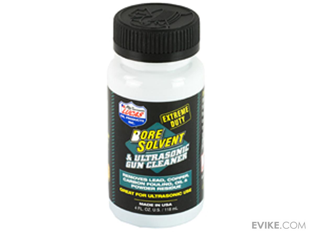 Used and recommended by major firearms manufacturers, Lucas Extreme Duty Bore Solvent & Ultrasonic Gun Cleaner is a premium blend of cleaning solvents and corrosion inhibitors. It easily removes carbon and powder residue from actions as well as copper and lead fouling from cylinders and barrels. The solvent based formula cleans deep to remove old oils and grease and provides a micro thin layer of rust and corrosion inhibitor on metal surfaces and bores. It is safe on polymers and factory applied firearm finishes.