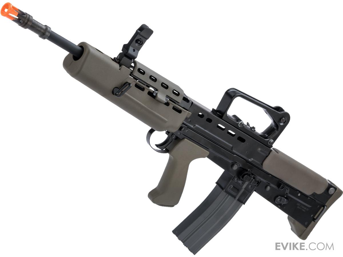 Features Stamped steel receiver with roll marks Electric blowback mechanism, bolt moves every time the L85 is fired, mimicking the real life counterpart Bolt locks to the rear to access hop-up unit Bullpup design allows for a shorter overall length without sacrificing barrel length Programmable mosfet and electronic trigger unit Durable polymer handguard with large battery space Removable front sight and rear carrying handle to accommodate for optics Tear-drop styled charging handle to assist with off-hand manipulation of the bolt FPS Range: 370-400