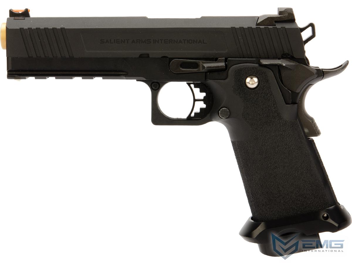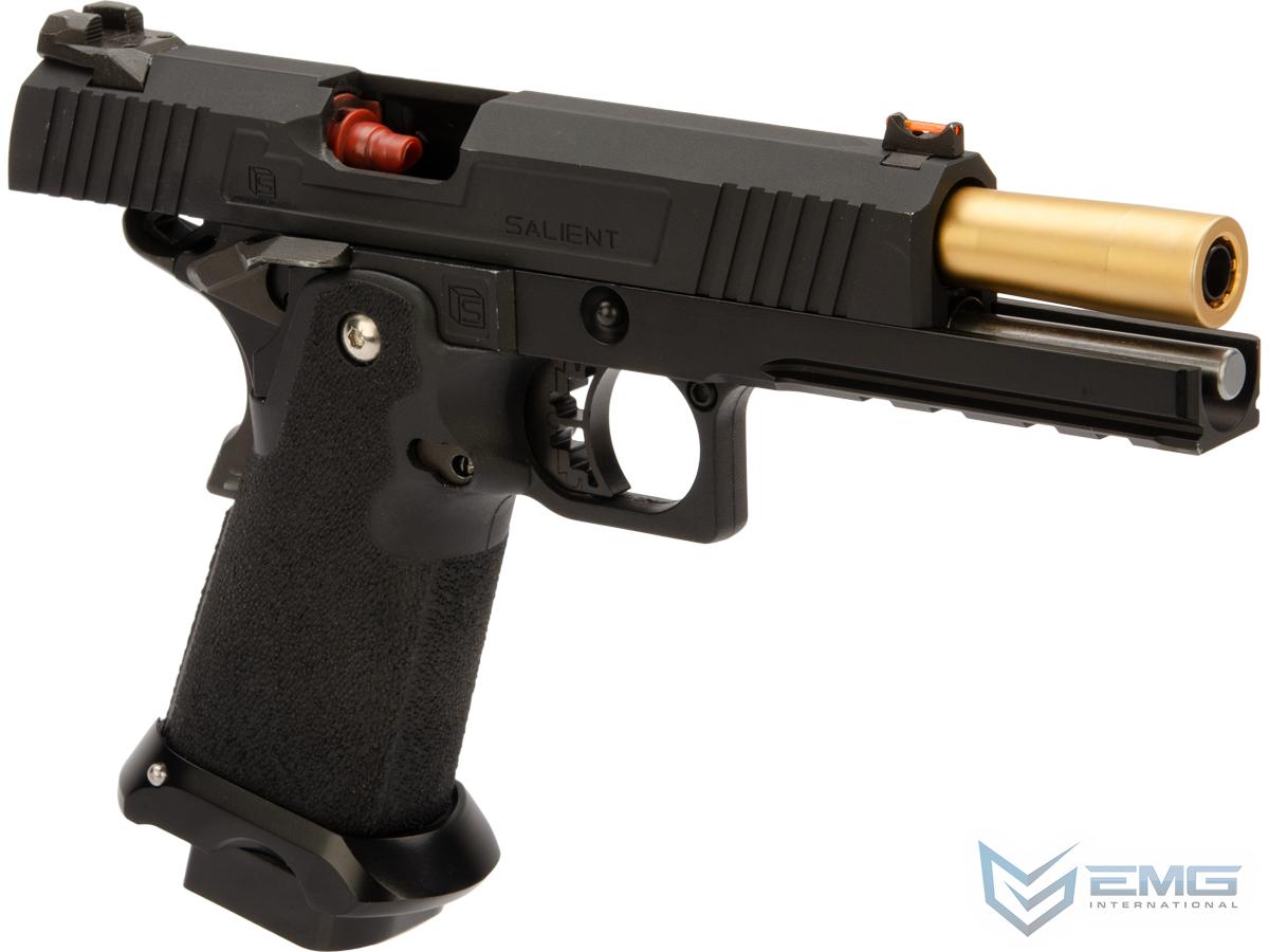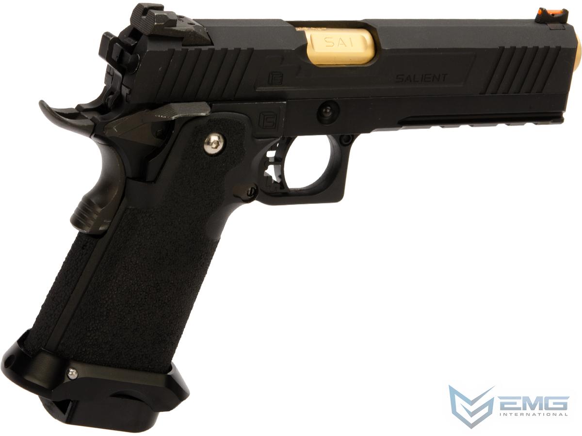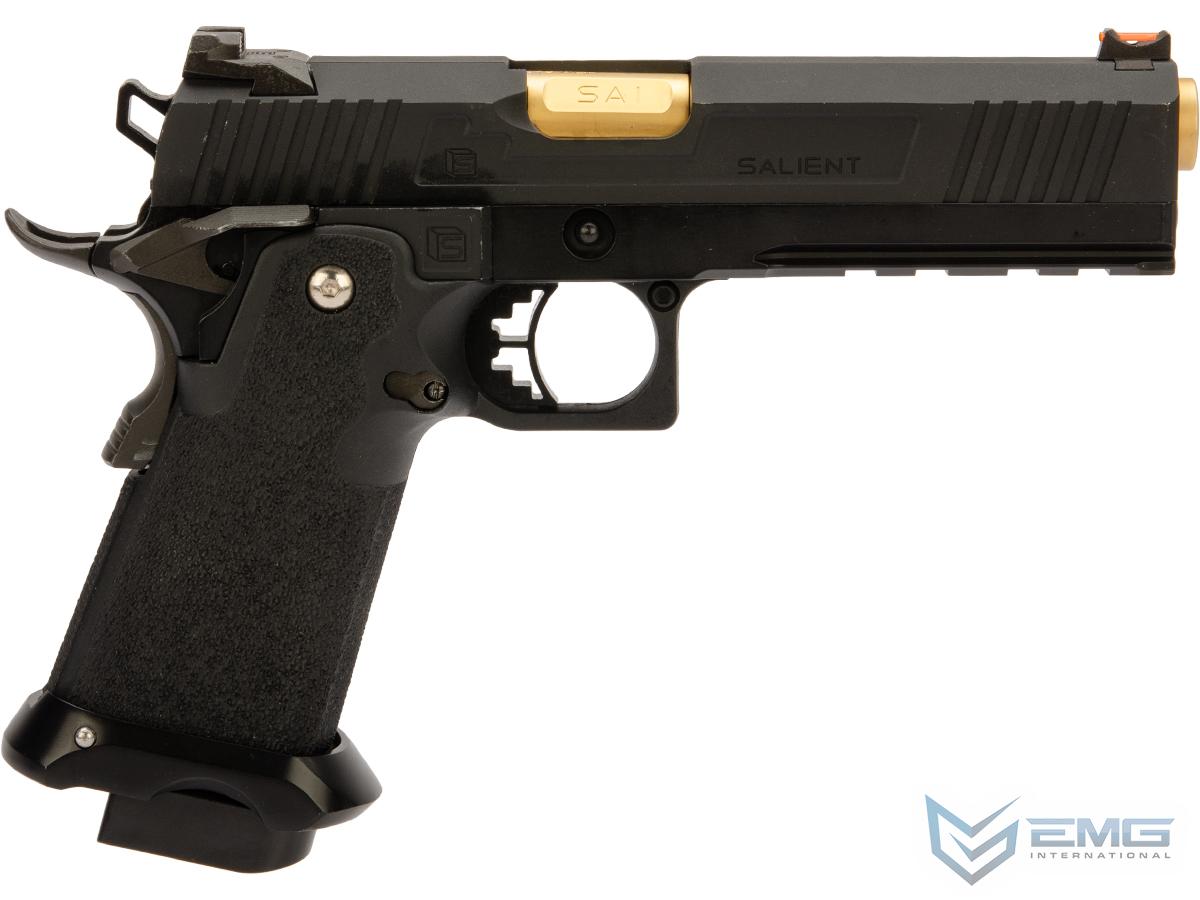 EMG has extended their collaboration with the Salient Arms and is proud to release the Salient Arms x EMG RED Hi-Capa collaboration Airsoft Training pistol. Manufactured with an eye to detail the EMG SAI RED Hi-Capa slide is CNC machined from aluminum alloy with an injection molded polymer frame. Additionally the pistol features all of the trademarks of a Salient Arms pistol, incuding: a titanium nitride style barrel, competition style sights with fiber optic front insert, ambidextrous safety and, of course, stamped Salient Arms International rollmarks. Utilizing the Tokyo Marui 1911 gas system, the Salient Arms / EMG RED Hi-Capa pistol can be upgraded from a wide pool of available parts and components, ensuring easy repair and maintenance and years of reliable service.