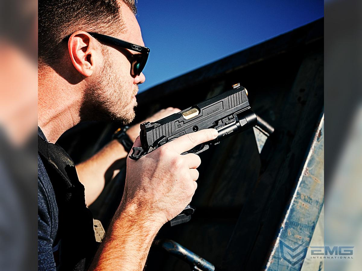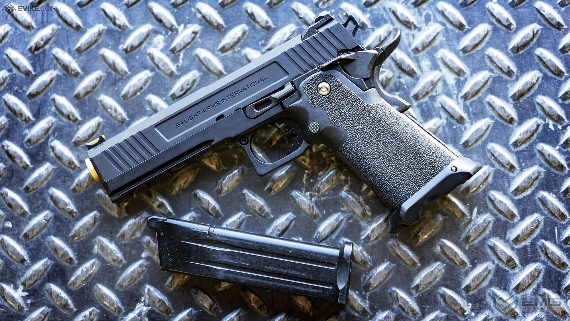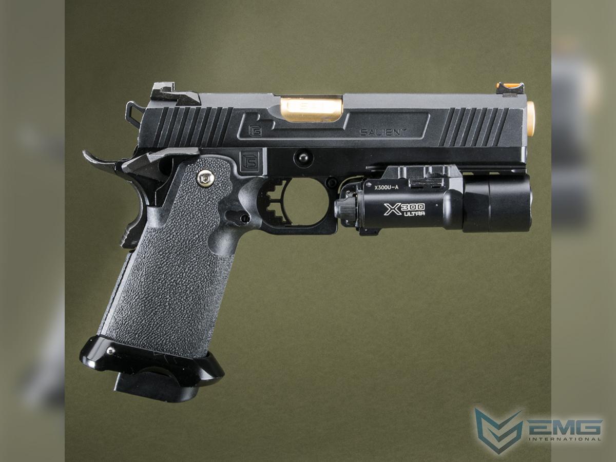 EMG has extended their collaboration with the Salient Arms and is proud to release the Salient Arms x EMG RED Hi-Capa collaboration Airsoft Training pistol. Manufactured with an eye to detail the EMG SAI RED Hi-Capa slide is CNC machined from aluminum alloy with an injection molded polymer frame. Additionally the pistol features all of the trademarks of a Salient Arms pistol, incuding: a titanium nitride style barrel, competition style sights with fiber optic front insert, ambidextrous safety and, of course, stamped Salient Arms International rollmarks. Utilizing the Tokyo Marui 1911 gas system, the Salient Arms / EMG RED Hi-Capa pistol can be upgraded from a wide pool of available parts and components, ensuring easy repair and maintenance and years of reliable service.