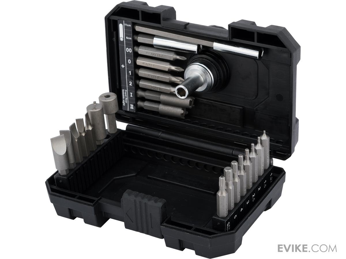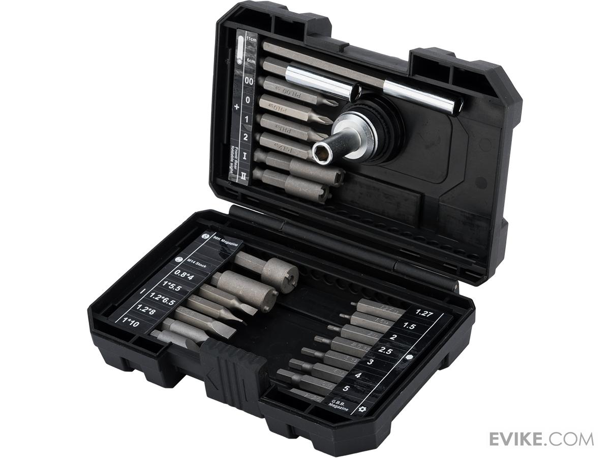 "Great lil toolkit! You have most bits to work on many airsoft guns, a small & durable case and a low profile/high tooth ratchet. The bit holder is highly magnetic so you won't drop your bit in a midst of a repair/cleaning/upgrade. The case easily fits into a military dopp/shaving kit, so you'll easily stow this toolkit almost anywhere and take it everywhere. I'd recommend getting separate sets of SAE & metric Allen tools and stowing them near this tool case so you'll be ready to accomplish any in field repair or adjustment. G&G made this product just right.