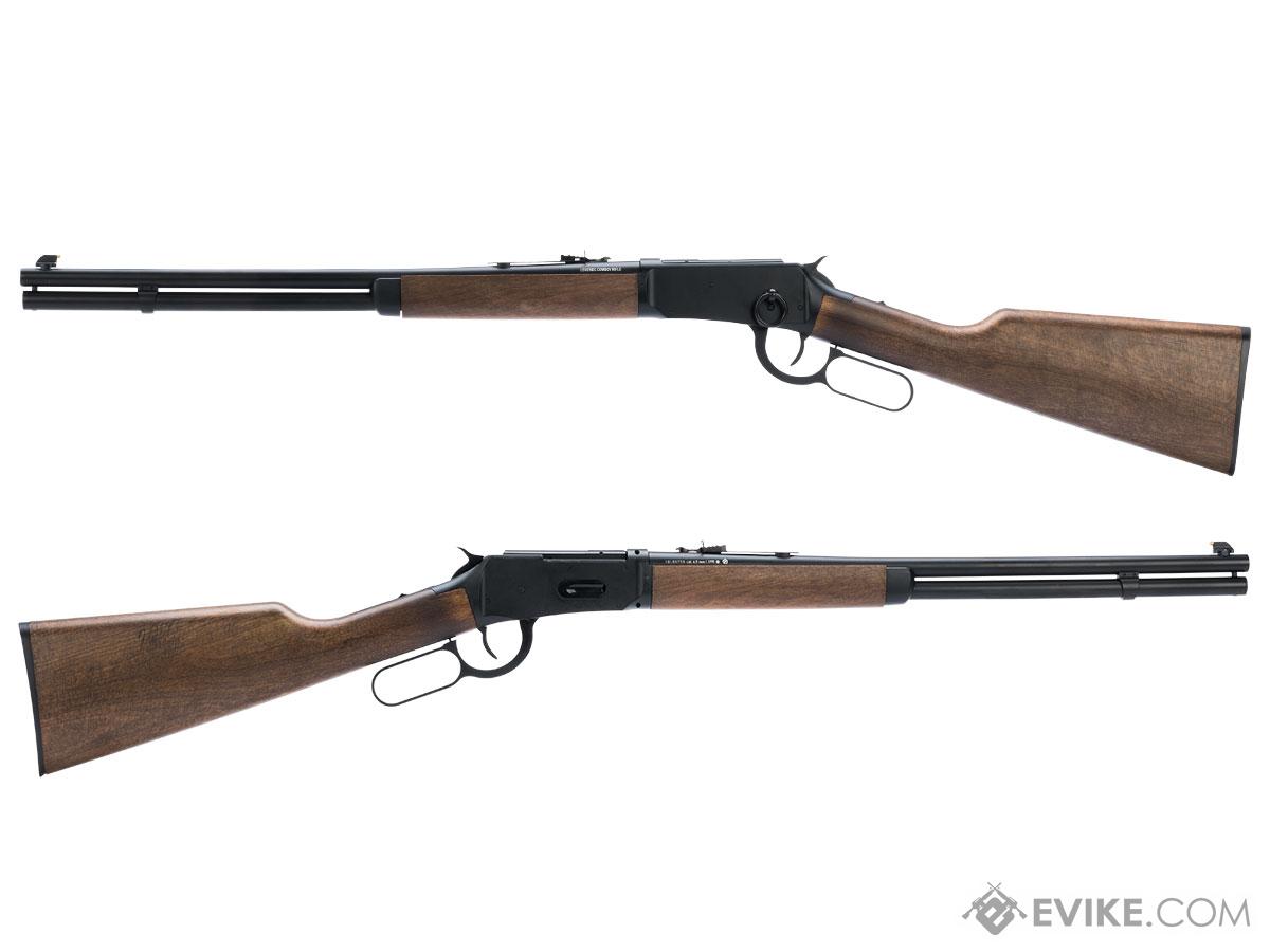 Now here's an air gun you just HAVE to have in your collection, but not just to look at. It's too fun to put on the wall. Images of the Wild West come alive with the Legends Cowboy Lever Action Air Rifle from Umarex Airguns! The Legends Series of air guns brings to life the classic arms of the past backed by the quality standards and imagination that only Umarex delivers. Stylized after the Model 1894, this backyard-friendly quiet CO2 rifle resembles the rifle regarded by gun historians as the "ultimate lever-action design". The Umarex Cowboy Lever Action spits shells when you operate the lever. You load it in realistic fashion, 10 BB cartridges inserted into its under barrel tube magazine. Put a little RWS Chamber Lube on the tip of two 12-gram CO2 cartridges and insert them butt-to-butt behind the hardwood stock's removable buttplate, cock the lever, then you are loaded and ready to send 10 shots downrange! Quickly operate the lever to shoot each round and eject the shell, just like the real steel powder burner, but in a backyard friendly quiet design. If cowboy action shooting is your thing, get this Lever Action Cowboy Air Rifle, a Colt Peacemaker Air Pistol, some CO2 and plenty of BBs, because you're about to give some steels and tin cans a run for their money.