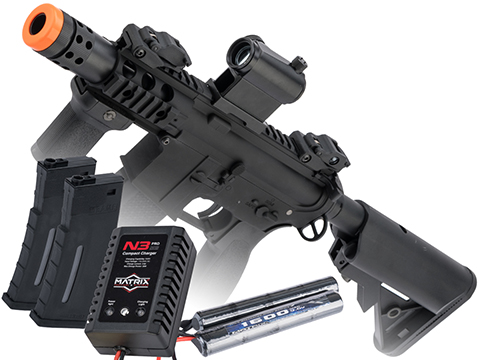 The Evike "Go Airsoft Starter Package" has been carefully curated to include the base essentials needed to get your AEG up and running for your first Airsoft game.Everything chosen for this package consists of highly recommended add-ons from both experienced players and technicians alike; great for first time players or for anyone looking for a backup set of accessories.The package includes: two high quality Matrix 7.4V butterfly type rechargeable battery packs so you will have a spare to swap to while the other charges, a universal smart charger that will optimally charge your batteries every time, a spare magazine to allow you to carry extra ammo out onto the field, a quick acquisition red dot optic for easy aiming, and finally an Airsoft Safety Sack to store your gun in during transport.