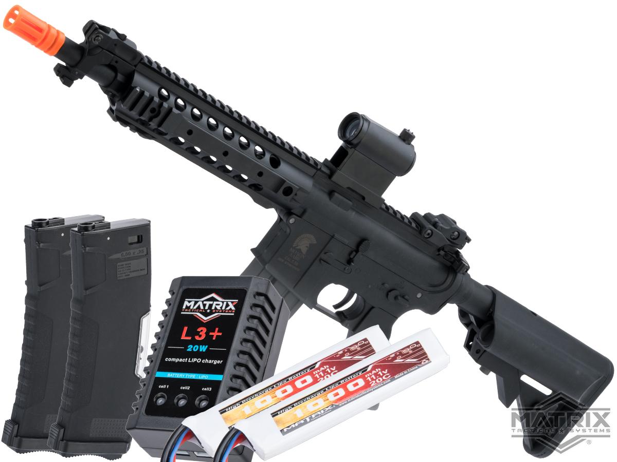 The Evike "Go Airsoft Starter Package" has been carefully curated to include the base essentials needed to get your AEG up and running for your first Airsoft game. Everything chosen for this package consists of highly recommended add-ons from both experienced players and technicians alike; great for first time players or for anyone looking for a backup set of accessories. The package includes: two high quality Matrix 11.1v rechargeable LiPo battery packs so you will have a spare to swap to while the other charges, a Matrix LiPo balancing smart charger that will optimally charge your batteries every time, a LiPo Safe charging bag, two spare BAMF Gen2 Mid Cap Magazines to allow you to carry extra ammo out onto the field, a quick acquisition red dot optic for easy aiming, and finally an Airsoft Safety Sack to store your gun in during transport.