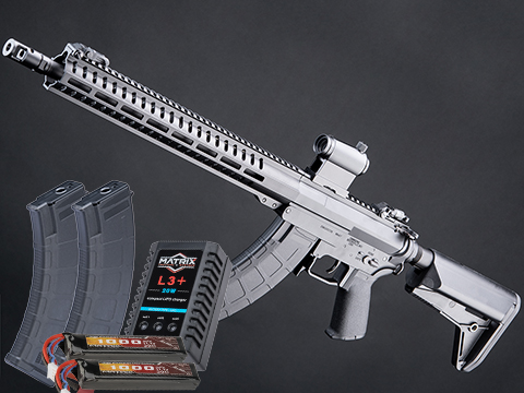The Evike "Go Airsoft Package" has been carefully curated to include the base essentials needed to get your AEG up and running for your first Airsoft game. Everything chosen for this package consists of highly recommended add-ons from both experienced players and technicians alike; great for first time players or for anyone looking for a backup set of accessories. The package includes: two high quality Matrix 11.1v rechargeable LiPo battery packs so you will have a spare to swap to while the other charges, a Matrix LiPo balancing smart charger that will optimally charge your batteries every time, a LiPo Safe charging bag, two spare 180rd Mid Cap Polymer AK Magazines to allow you to carry extra ammo out onto the field, a quick acquisition red dot optic for easy aiming, 5,000 EMG International Match Grade BBs in a convenient and reusable "Oil Can" styled bottle, and finally an Airsoft Safety Sack to store your gun in during transport.
