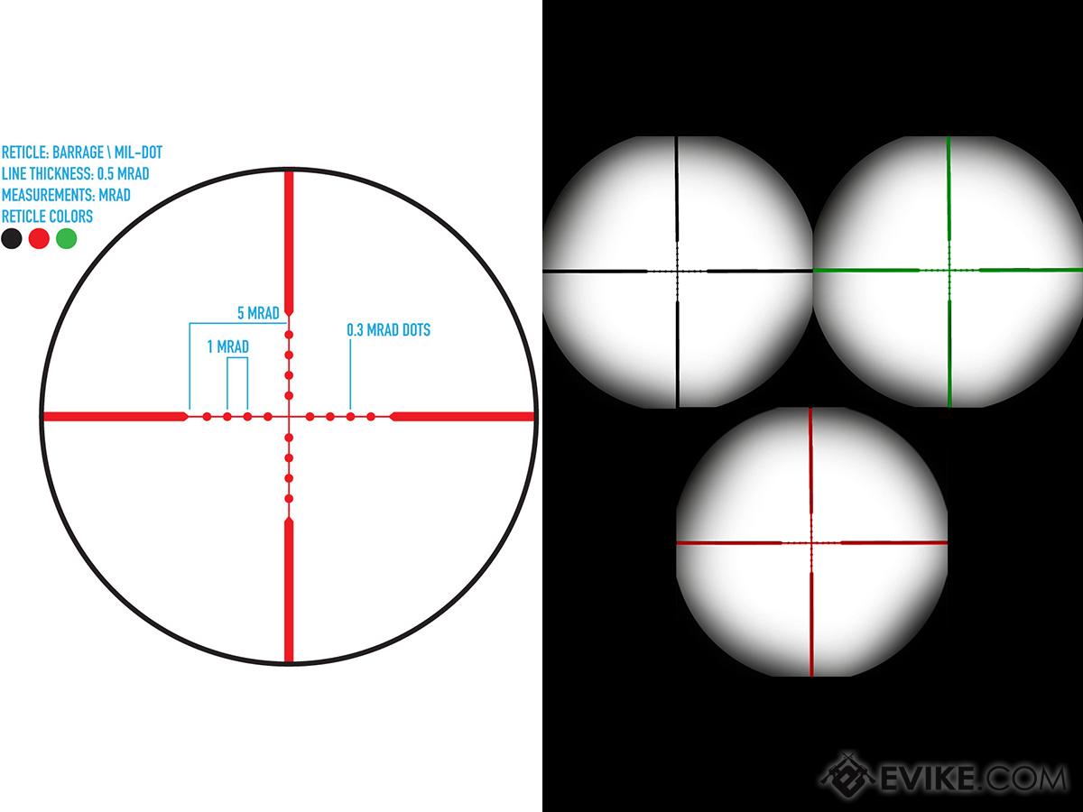 From close quarter missions to engaging mid-range targets, the Firefield Barrage 1.5-5x32 Riflescope with Red Laser is the perfect sight for .223 rifles. Built rugged and reliable for the long haul, IPX4 waterproof Barrage riflescopes also boast an aircraft-grade 6061-T6 black anodized aluminum tube, 2 piece mount design and a bullet drop compensation reticle designed for 55gr .223 with quick elevation adjustments out to 500 yards. While Barrage Riflescopes are deigned to handle your toughest engagements, it's the Barrage's fully multi-coated AR green scratch-resistant, anti-reflective glass, precision 5mW 532nm Class IIIA red laser, illuminated red/green Mil-Dot reticle and 100-hr battery life that get you on target and keep you there in low light situations.