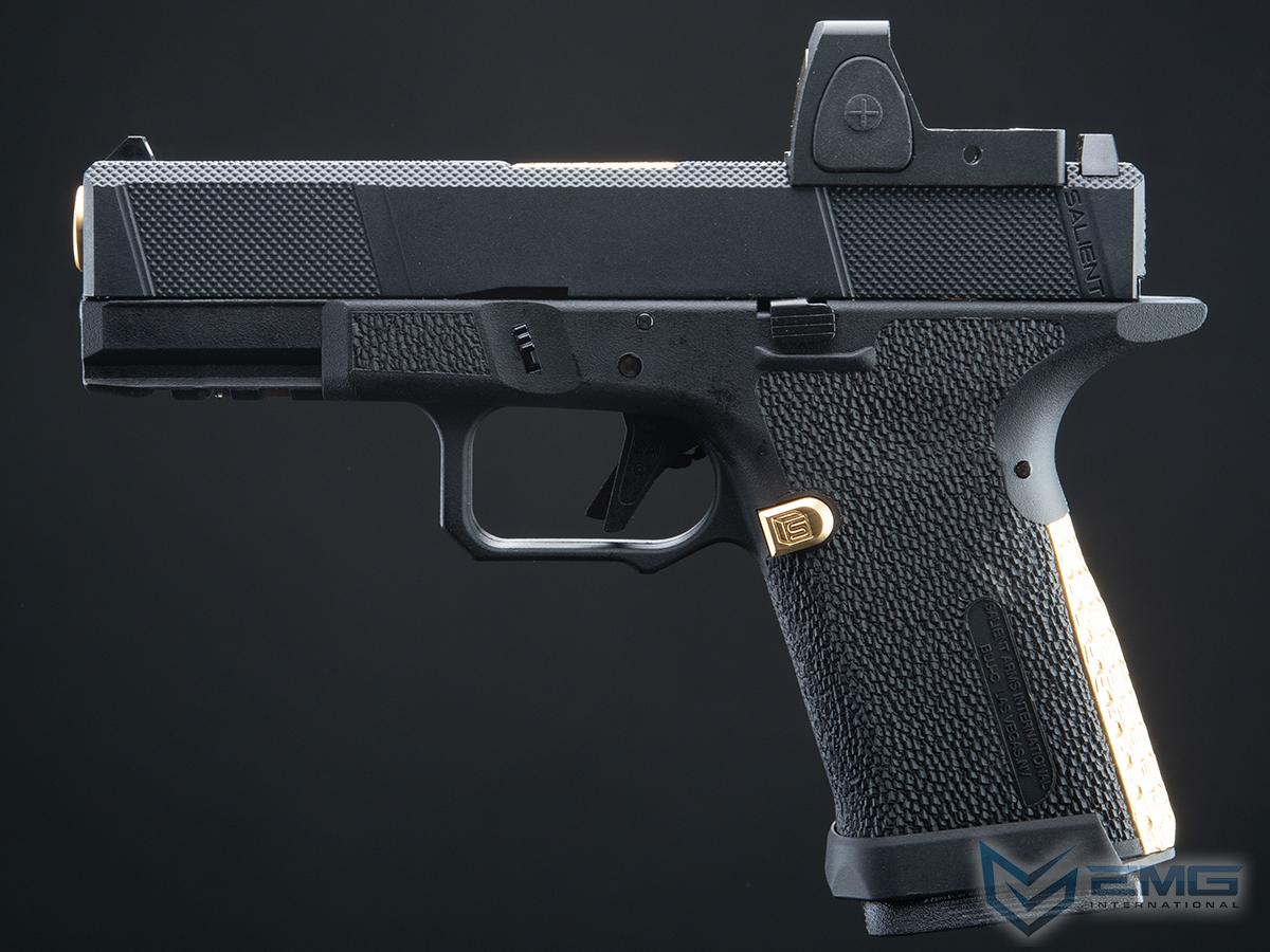 EMG has furthered their collaboration with Salient Arms International with a new pistol as the platform. Designed closely with the geniuses at SAI, the EMG / SAI Tier One Utility Package is designed to be as close to the real thing as possible offering shooters and enthusiasts the most realistic training analog available. Using the popular EMG Salient Arms International BLU Compact as the base, the Tier One Utility Package Pistol features a machined aluminum slide with hyper-aggressive front, rear, and top knurling to greatly improve grip no matter the situation. The Titanium Nitride styled box fluted barrel from Salient Arms comes standard with this pistol. Authentic rollmarks and branding top off the look, making it almost impossible to differentiate the 6mm version, from the 9mm version.