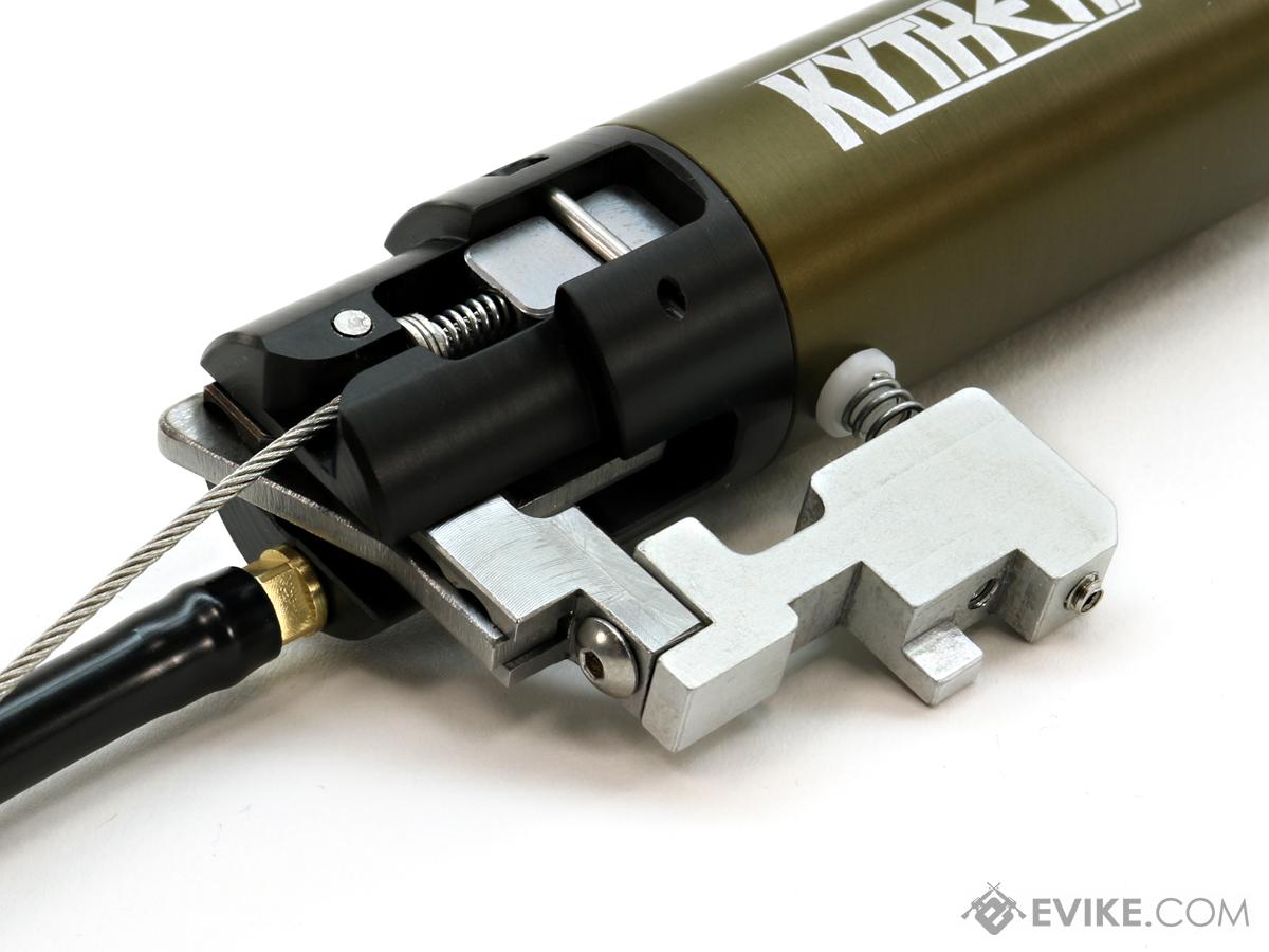 Wide Velocity Adjustment Range: The Kythera has a wide operating pressure range of 60psi to 180psi which allows you to fine tune the velocity of the system and tailor for different requirements and applications. Within this pressure range we observed a muzzle velocity of 270 - 500fps w/ .20g using a 6.05x380mm barrel. This lets a single Kythera be used in any role ranging from CQB to Sniper by mainly just adjusting the input pressure from your air rig.
