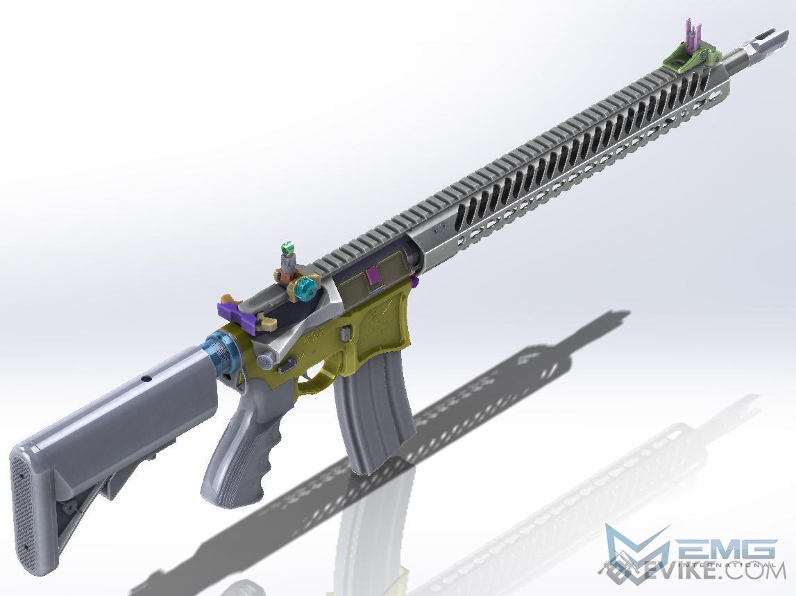 EMG has partnered with Seekins Precision and Airsoft manufacturing powerhouse G&G Armament to bring to the market, the first and only officially licensed Seekins Precision AR15 training AEG. EMG worked closely with the staff at Seekins to make sure that all the details, down to the finest markings were accurately reproduced in this full size AEG rifle. Like it's steel family member, the EMG Seekins receiver is CNC machined from a lightweight yet durable aluminum alloy, keeping weight down, but providing the user with the unmistakable feel of a Seekins Precision SP223 billet receiver. The forward portion of the EMG Seekins rifle features a perfect replica of the Seekins Precision SBR8 Keymod rail. Built 100% from the original blueprints, EMG's SBR8 rail is painstakingly machined from aluminum alloy to accurately reflect the weight and feel of the real thing.
