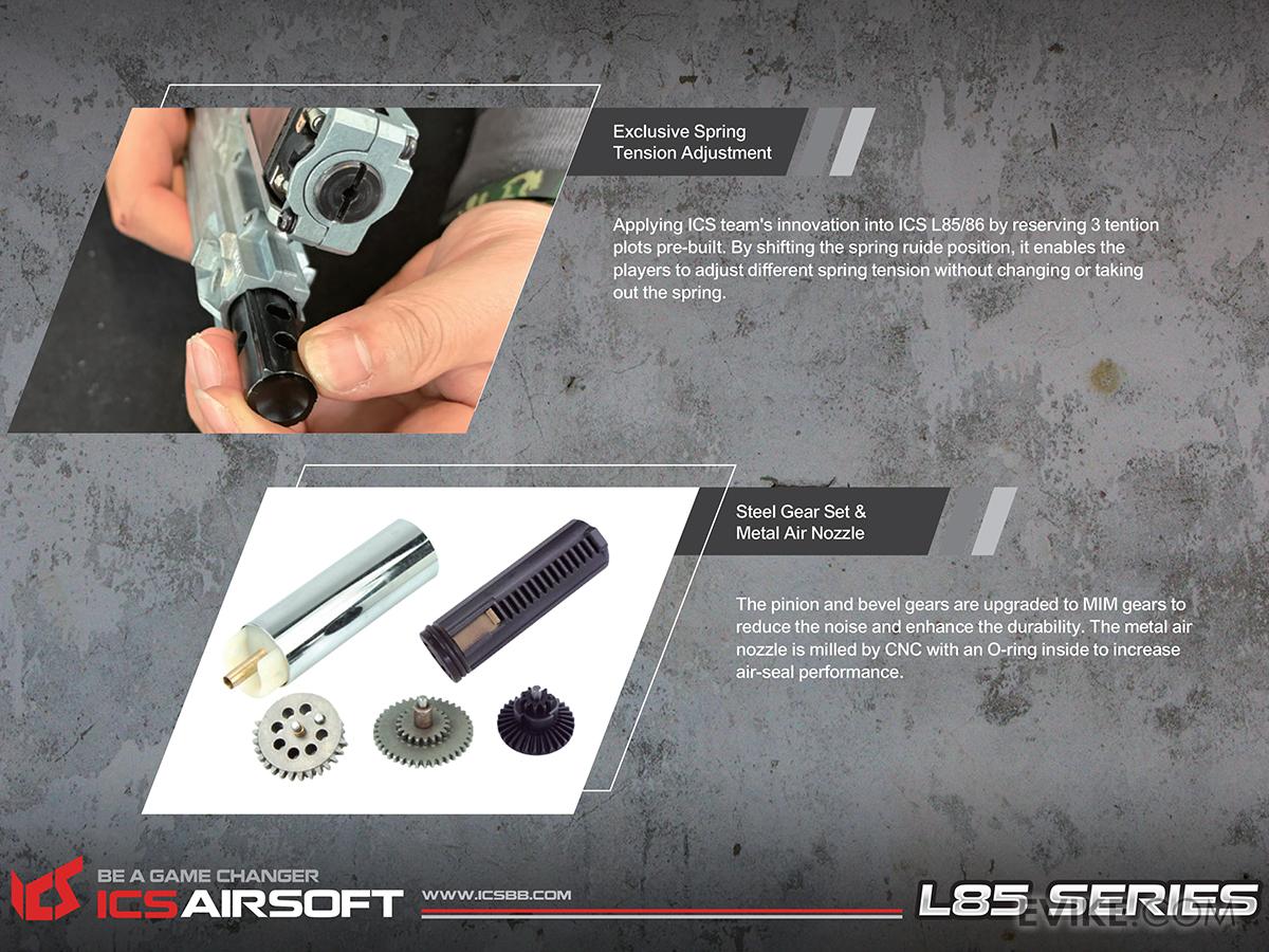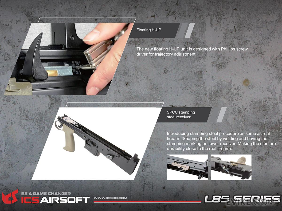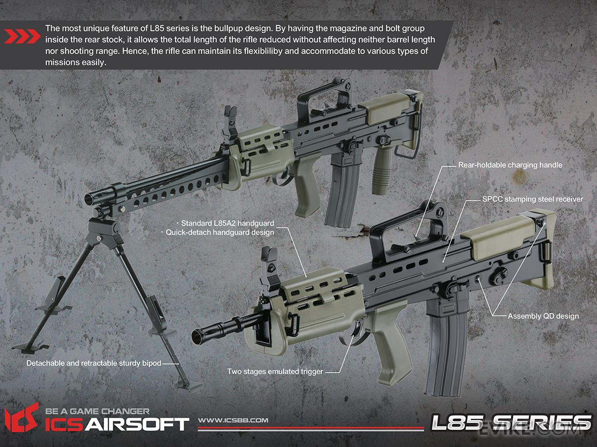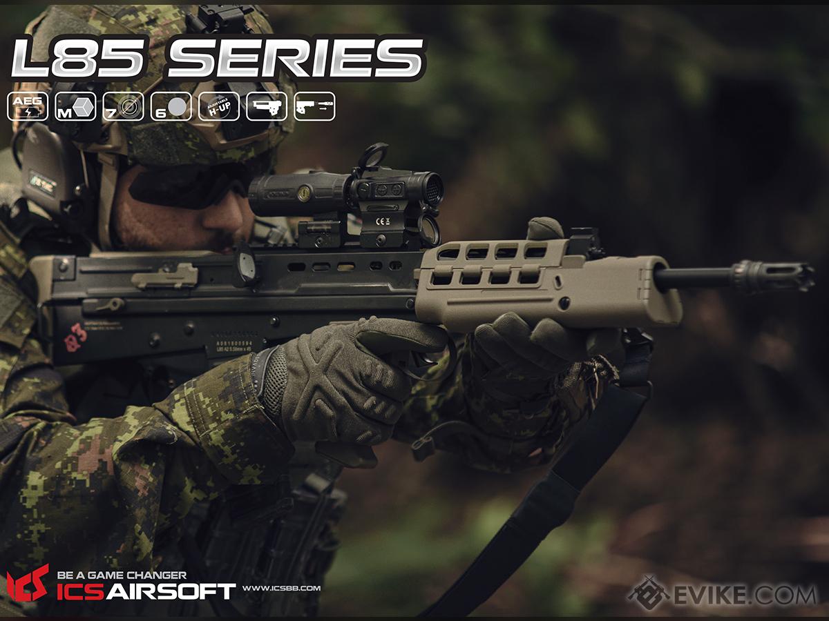 With amazing performance and reliability, the ICS L85 series of AEGs features a fantastic gearbox with high quality parts, adjustable spring guide to quickly change your spring, or FPS. Featuring a durable stamped steel metal body and nylon-reinforced polymer, the ICS L85 is a wonderful replica of the primary British service rifle.