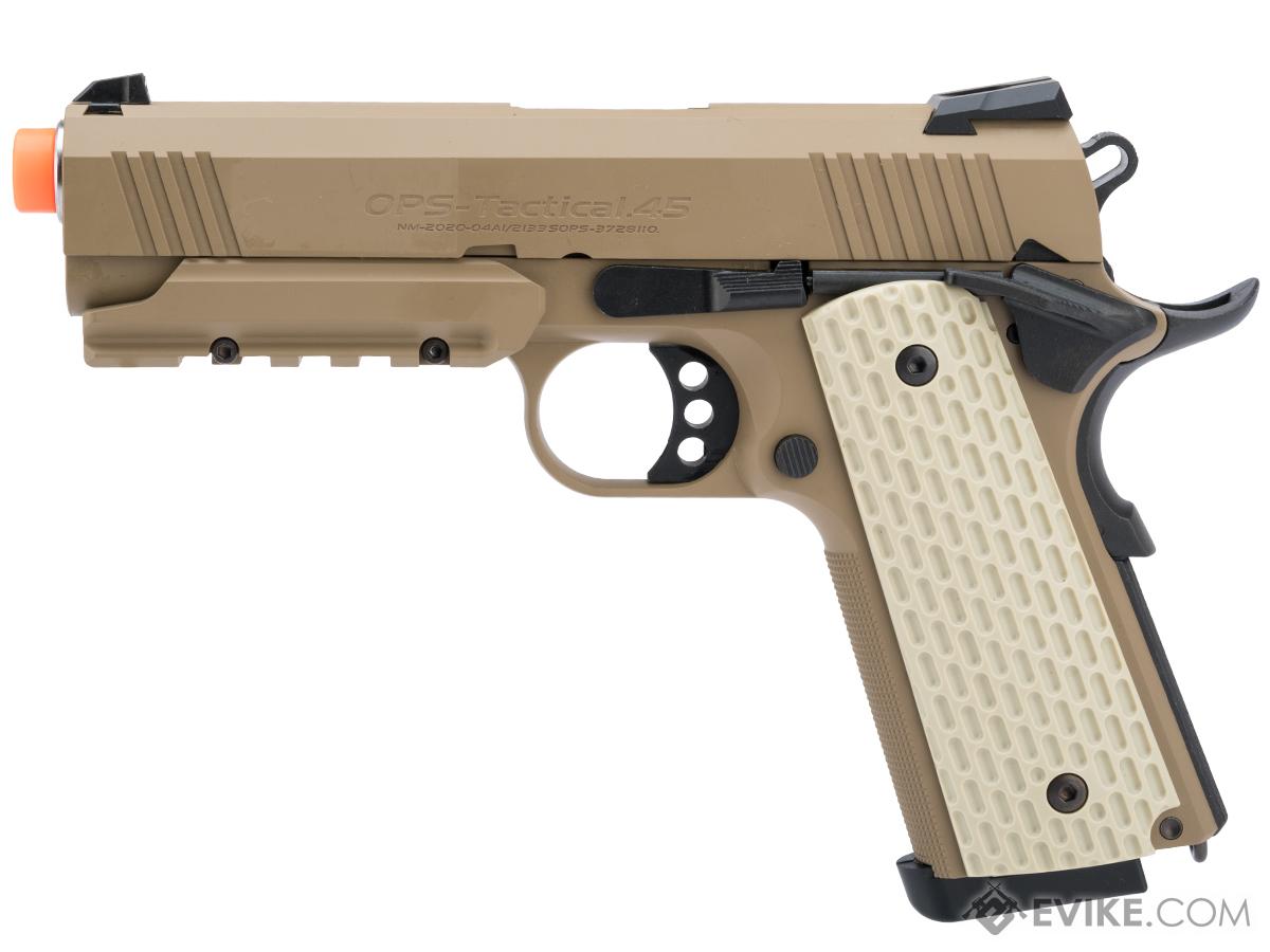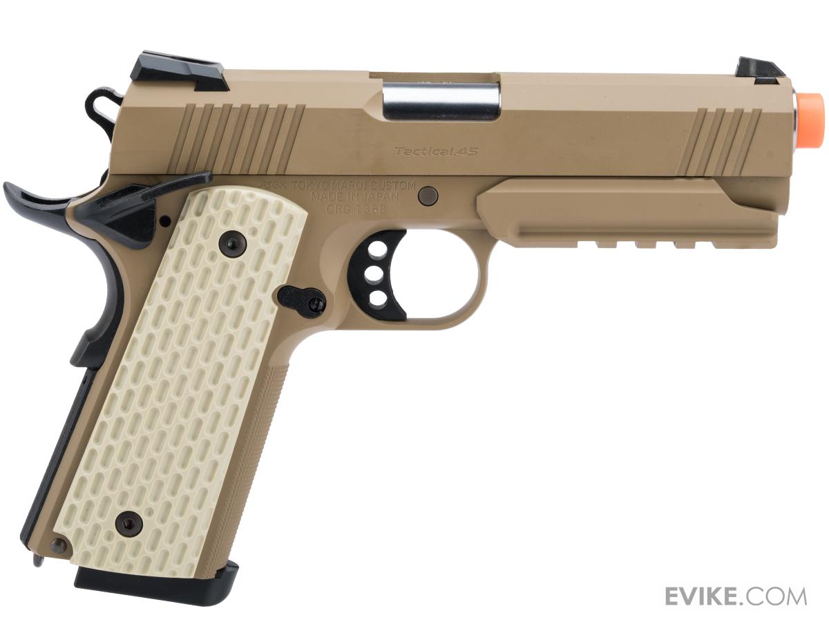 The Tokyo Marui Desert Warrior 4.3 is based on a special version of the United States Marine Corps Forces Special Operations Command MARSOC pistol. Inspired by the Kimber ICQB (Interim Close Quarter Battle) pistol, the Desert Warrior 4.3 has textured tan plastic grip panels, low profile sights, railed frame, an ambidextrous thumb safety, a lanyard loop, and full length 4.3 recoil spring guide rod.
