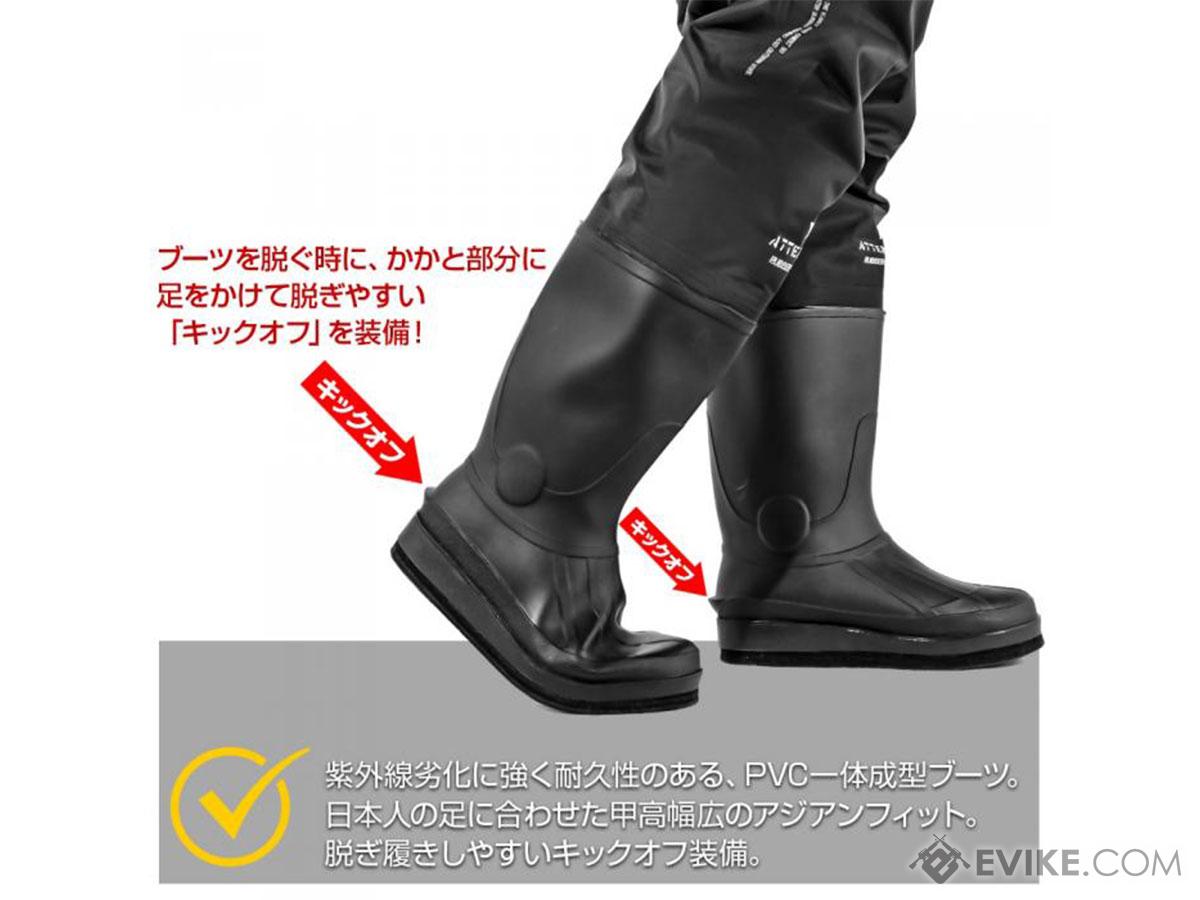 Wader Shape: Hip High WaderBoots: PVC Integrally-molded boots. Asian fit w/ wide instepSole: Felt Spike Sole. Kick-off equipment that is easy to put on and take offWaist Belt: Adjustable Belt loopMaterial: 420D Nylon / PVC