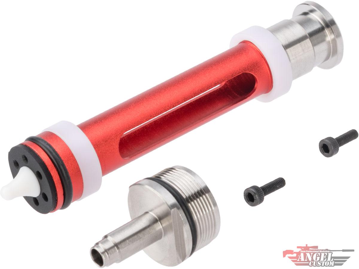 • The Angel VSR-10 Cylinder Head and Piston Head: The inherent design flaw of the Tokyo Marui VSR-10 is its original 45 degree piston head. When a M150 or higher power spring is installed, the piston sear will start to stress the piston and moving the piston forward. As a result, the piston will experience a large amount of friction with the cylinder when you pull and push the bolt. The complete Alpha Pro Trigger System allows provides a Piston featuring a 90 degree aluminum piston with steel end cap and a new concave front end design as well as a stainless cylinder head with concaved rear end design.