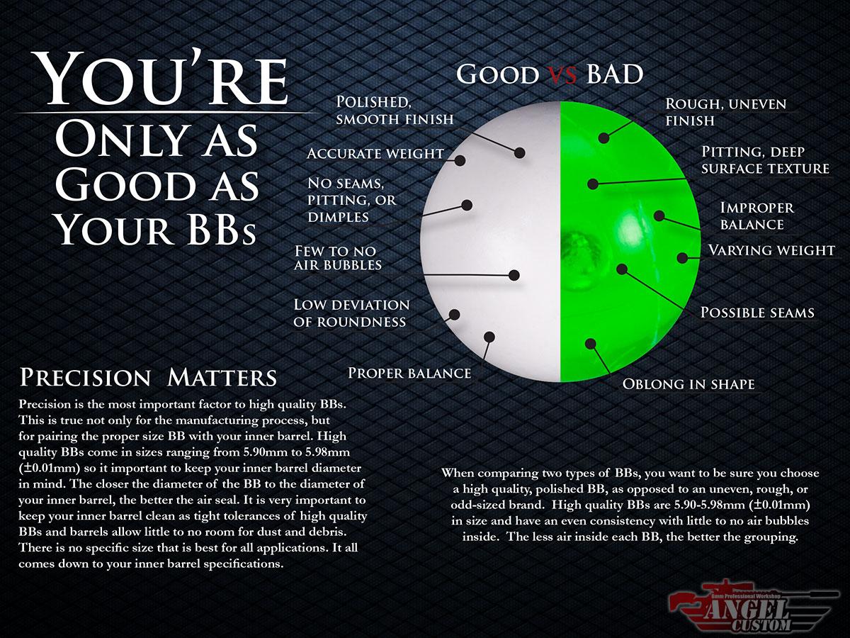 Angel Custom Professional Grade BBs produce extremely consistent results with accuracy and range. Each Angel Custom BB is carefully manufactured into a 5.98mm sphere, then highly polished to prevent jamming and ensure maximum performance.