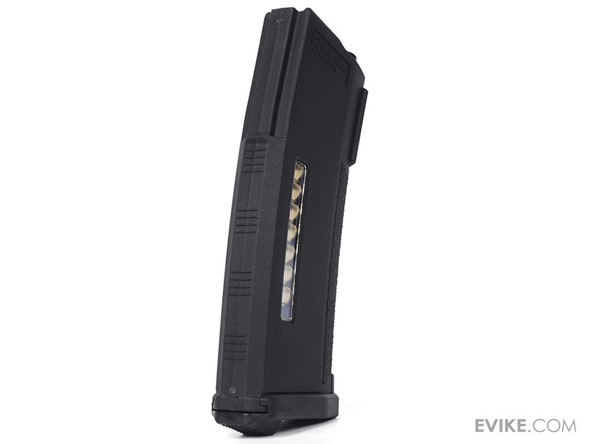 The PTS Enhanced Polymer Magazine (EPM) is a new take on the mid-capacity polymer mags for airsoft AEG's. Constructed from Dupont Zytel Polymer, this magazine is remarkably rugged and features a solid weight. The recessed panels allow for a better grip and the unique mag well guides help reduce the possibility of snagging when being drawn or reinserted into pouches. The bullet window features realistic looking dummy 5.56 rounds and even has a visual indicator at the bottom of the clear window to show the magazine is full (orange follower will be visible when fully loaded).